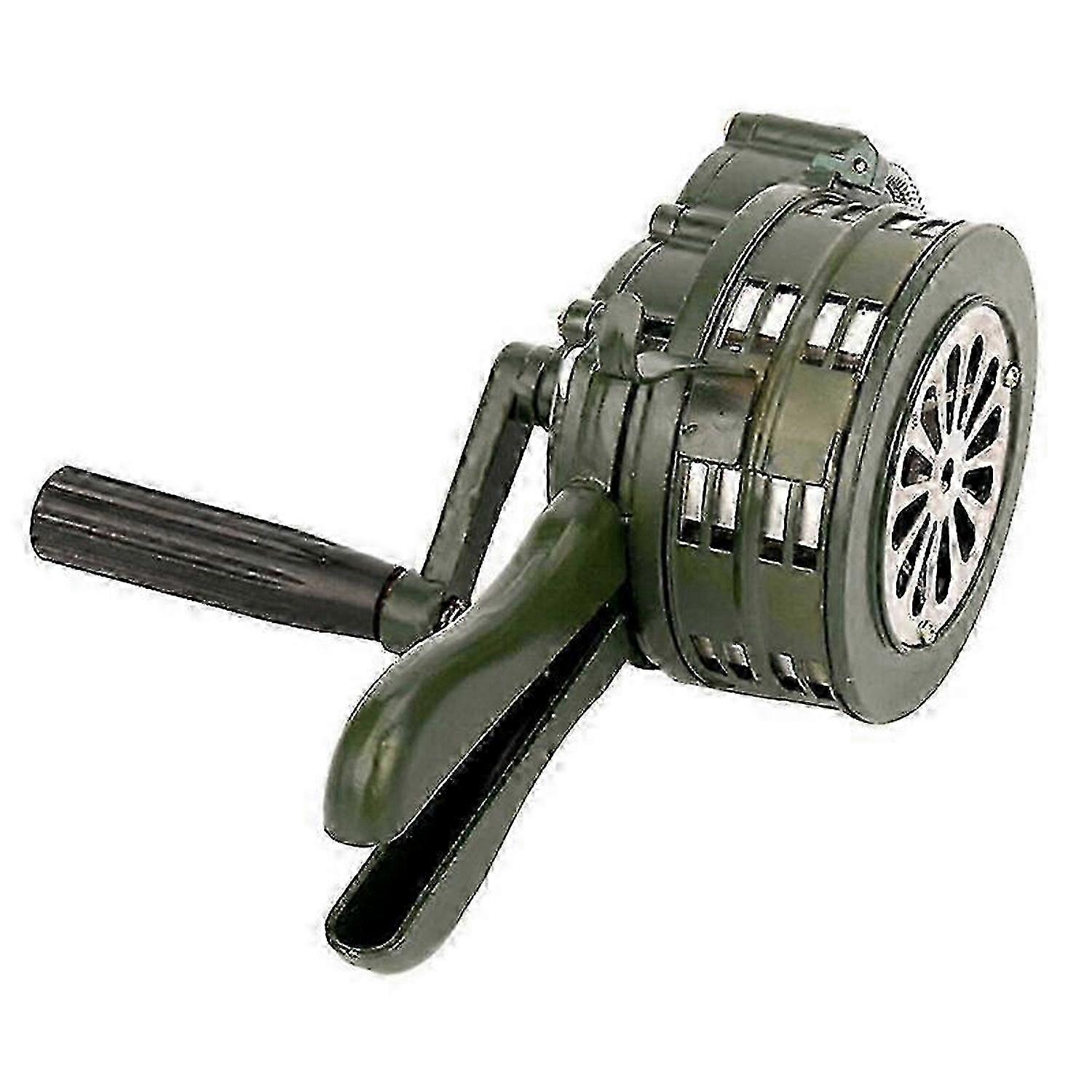 Emergency hand-cranked alarm horn, 110 decibels, manually operated, warning for school and shopping mall fires, aviation safety alarms.