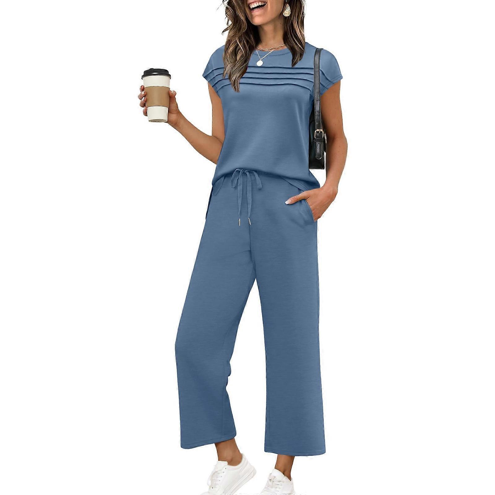 Women's Casual Travel Vacation Two-Piece Short-Sleeved Loungewear Set Sky Blue XL