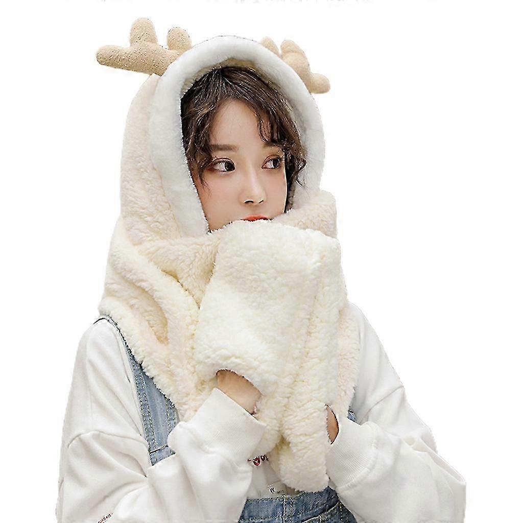 Women's Reindeer Antler 3-in-1 Plush Hoodie Hat with Scarf & Gloves, Gray