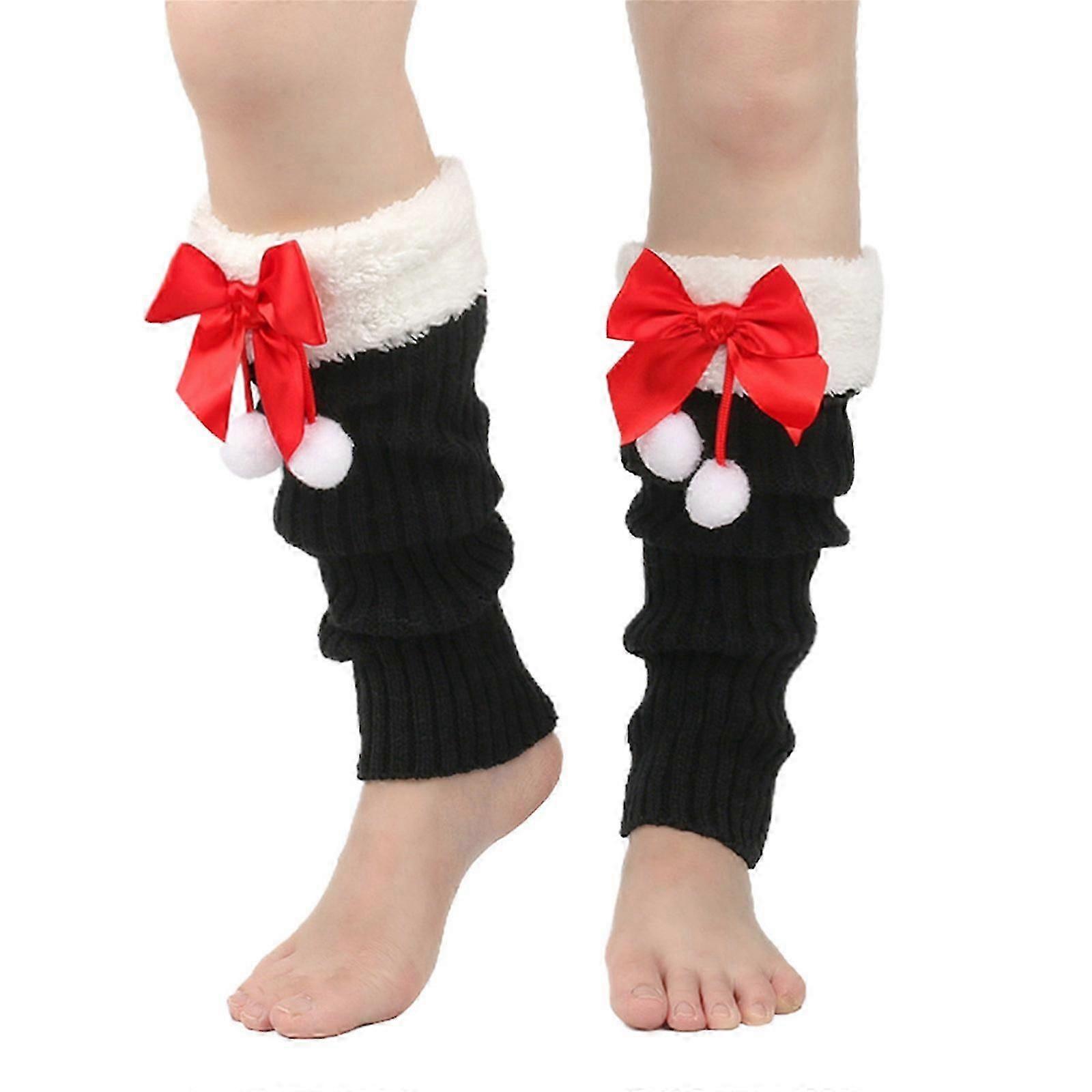 Festive Red Knit Leg Warmers with Fleece Trim & Plush Balls