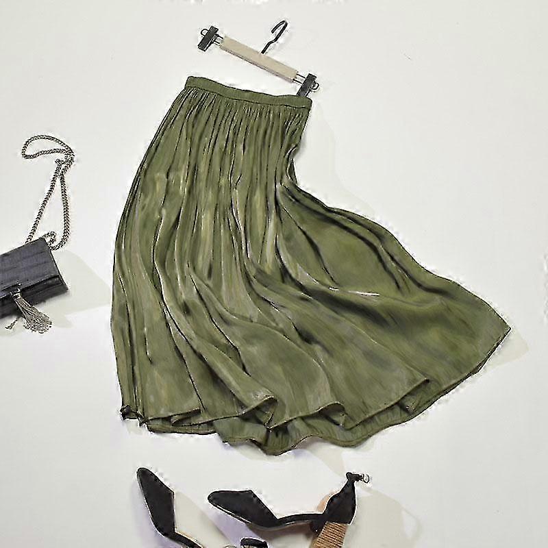 2025 Elegant Solid Midi Pleated Skirt Women Korean High Waist Spring Summer Ladies Satin Maxi Skirt Female Faldas Saia B-032