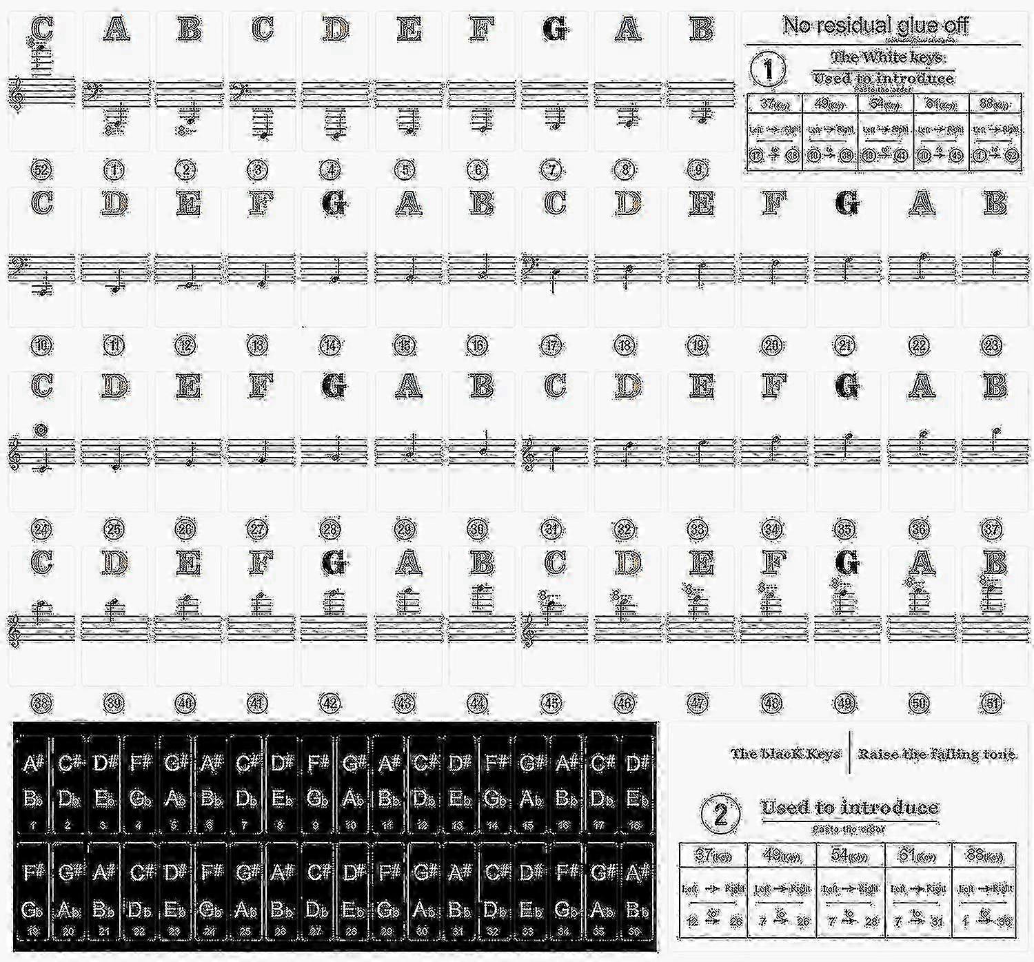Description Reusable and TransparentMade of eco-friendly PVC, transparent as printed on the keys, removable but wont leave glue marks or damage your keyboardThoughtful UniversalIncluding 52 white color stickers and 36 black notes, a total of 88 stickers Banger keyboard stickers for most pianos include 37/49/54/61/88 keys Clear PrintingPiano keys are marked under the top layer to prevent ink fading; bigger and more colorful bold letters and sticks help kids or beginners learn keyboard faster and greatly improve the efficiency of practice Easy to Install and Thinner MaterialThe 2 rails on the top right and bottom right can help you install them in minutes Piano key stickers are 50% thinner than normal stickers You barely feel their presence