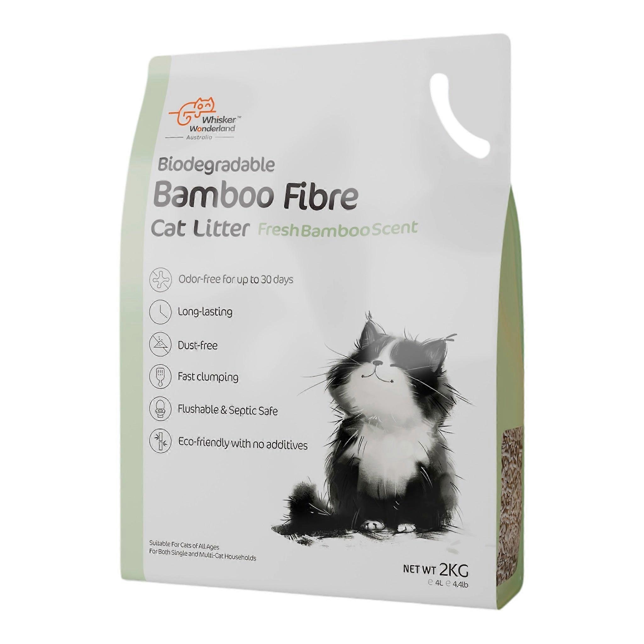At Whisker Wonderland We Understand Your Deep Affection For Your Pets And Your Commitment To Environmental Responsibility. That's Why We've Meticulously Crafted This Biodegradable Bamboo Fibre Cat Litter (2Kg). It's More Than Just Litter; It's Our Pledge To A Sustainable Lifestyle. We Carefully Select Natural Bamboo Fibre As The Primary Raw Material Processed Using Special Techniques To Ensure Every Granule Is Pure And Harmless Free From Irritating Chemicals Providing A Safe And Comfortable Toilet Environment For Your Feline Friend. This Cat Litter Boasts Impressive Absorbency And Odour Control. The Natural Porous Structure Of Bamboo Fibre Allows It To Rapidly Absorb Urine And Lock Away Odours Keeping Your Home Smelling Fresh And Pleasant. The Unique Fast-Clumping Formula Makes Cleanup Exceptionally Simple. When Your Cat Uses The Litter Box The Litter Quickly Forms Solid Clumps That Are Easy To Scoop Avoiding The Crumbling And Residue Issues Of Traditional Litters. What's More Our Bamboo Fibre Cat Litter Can Be Flushed Directly Down The Toilet Offering Truly Convenient And Mess-Free Disposal Significantly Reducing Waste And Contributing To Environmental Protection. We Are Well Aware Of The Potential Impact Of Dust On Your Cat's Respiratory Health. Therefore Whisker Wonderland Bamboo Fibre Cat Litter Features An Advanced Dust-Free Formula Minimising Dust Production To The Greatest Extent Protecting Your Pet's Respiratory System And Ensuring A Cleaner Home Environment. For Pet Owners Who Value Sustainability And High-Quality Living This Cat Litter Is Undoubtedly An Ideal