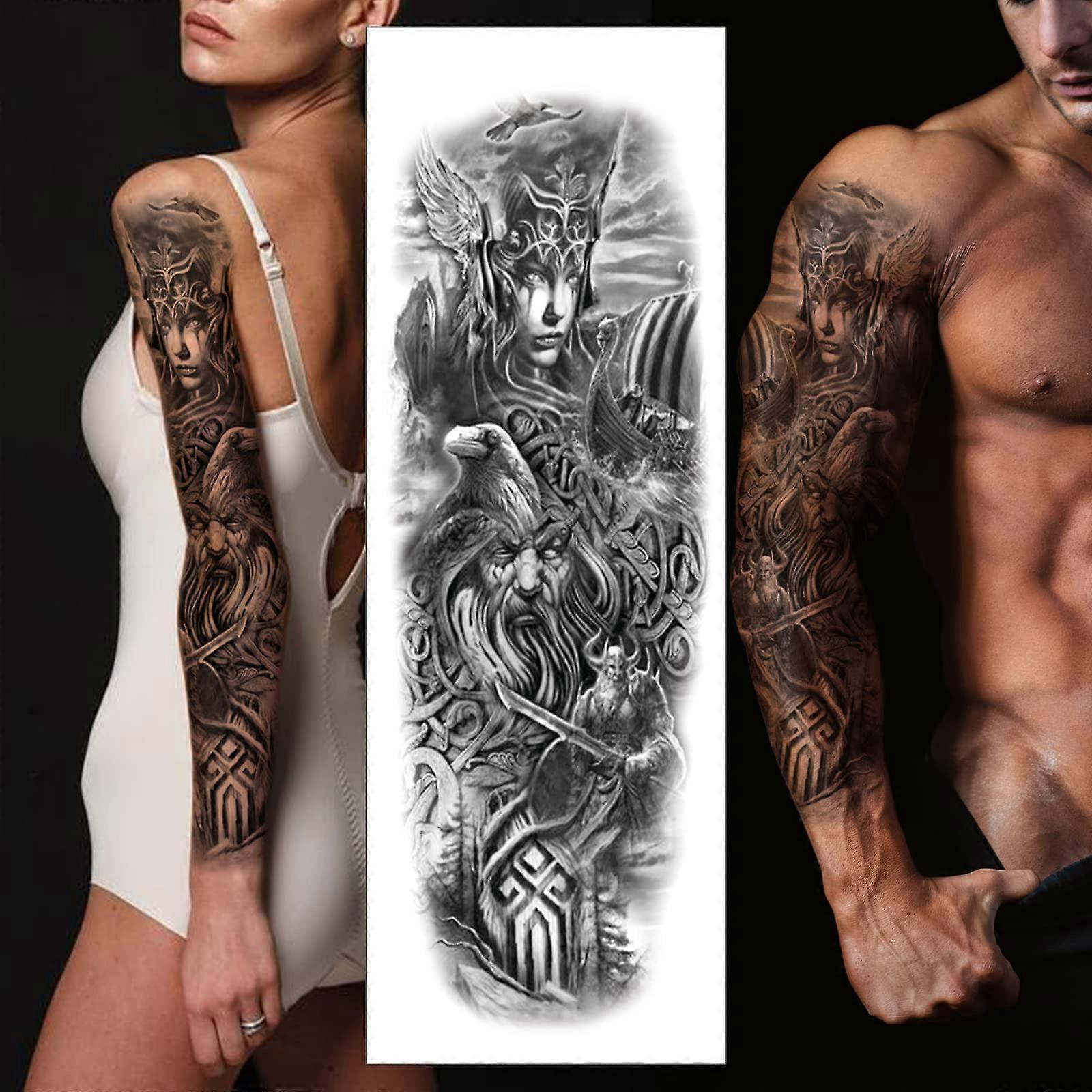 Temporary Full Arm Tattoo Sleeve with Realistic 3D Nordic Odin Design, Large Waterproof Body Art Sticker