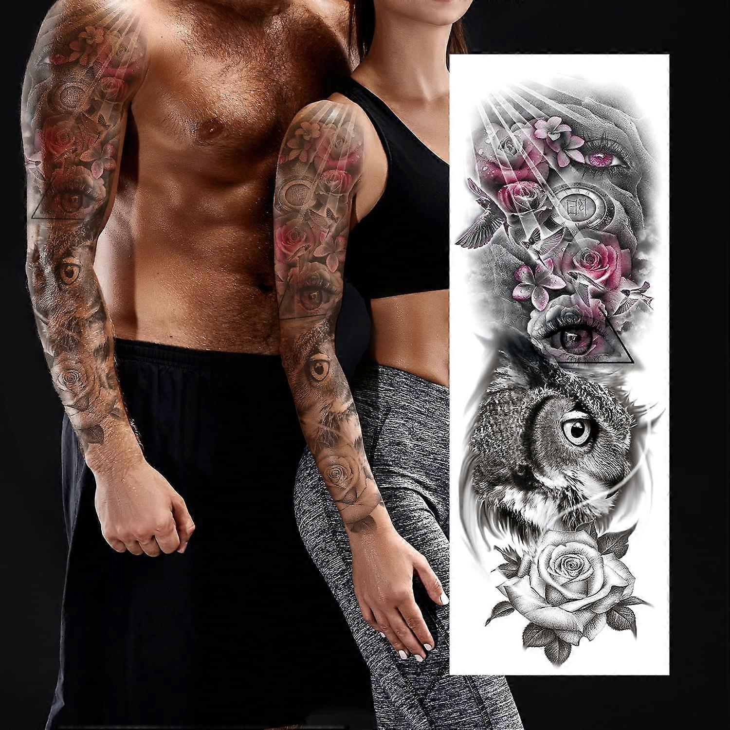 Temporary Tattoo Sleeve Waterproof Full Arm Owl and Flower 3D Realistic Design for Men and Women