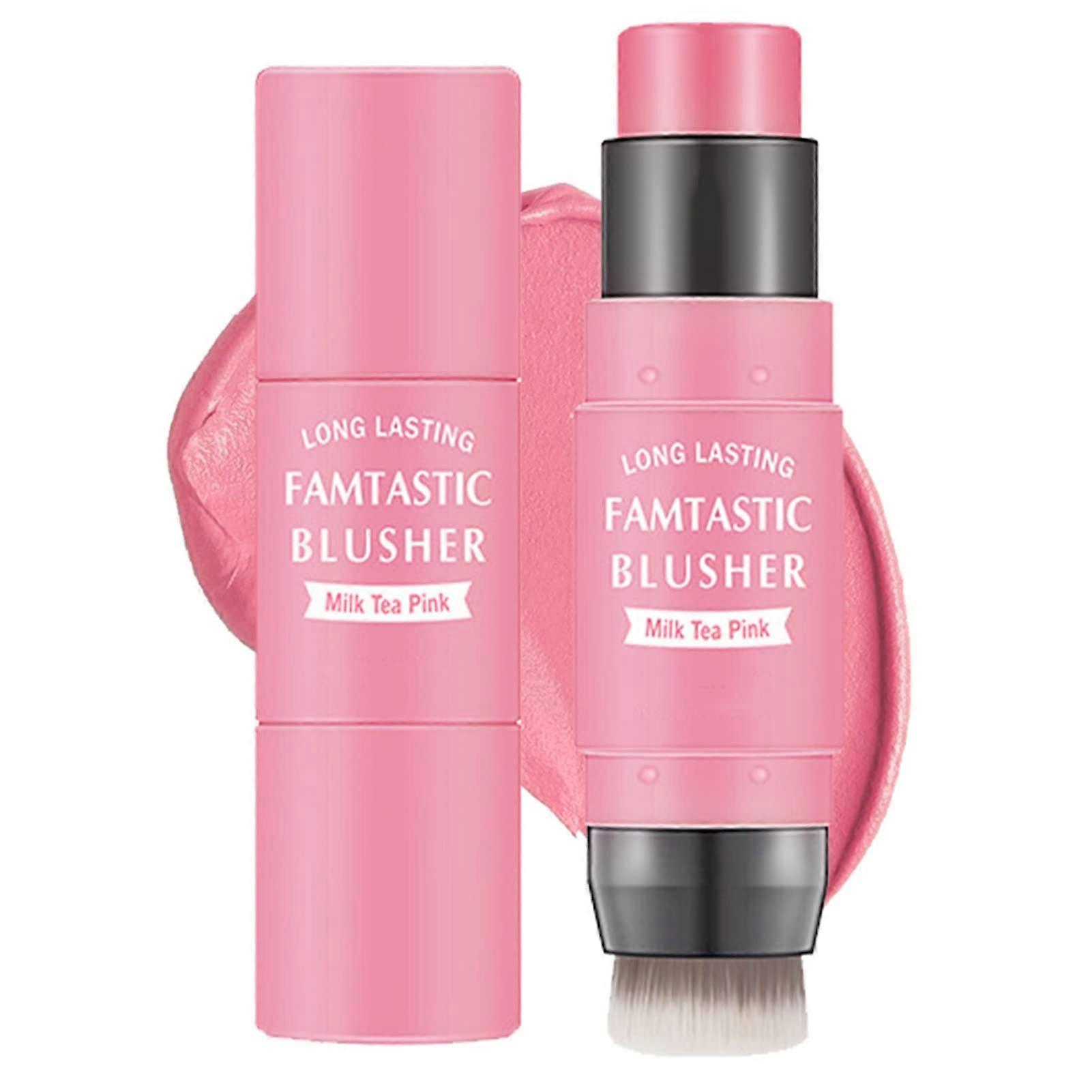 2in1 doubleended cream blush stick with a cream applicator on one end and a microfiber brush on the other, designed for convenient carrying and easy, precise application. Key benefits Dualfunction design: cream blush tip deposits smooth color, while the builtin microfiber brush blends for a polished, natural finish. Versatile use: suitable for cheeks, lips, and eyes to create a soft, monochromatic look with minimal tools. Three shade options: Cherry Pink, Rose Red, and Coral Orange to complement a range of skin tones. Skinfriendly formulation: blends into skin for a hydrated, natural appearance without heavy buildup. Waterresistant formula: formulated to resist smudging and sweat for more reliable wear. Compact and portable: slim, doubleended wand fits in a pocket or small bag for quick touchups on the go. How to use Apply the cream tip to the apples of the cheeks, the center of the lips, or the eyelids. Use the microfiber brush on the opposite end to buff and blend until you achieve the desired intensity and seamless finish. Practical use scenarios Daily commute: quickly add color to cheeks and lips for a fresh, puttogether look before arriving at work. Travel or gym bag: compact design makes it simple to refresh your makeup after a workout or between flights. Quick evening touchup: blend a single shade across cheeks, eyes, and lips to create a coordinated, loweffort evening look. Materials and performance Cream blush formula paired with a soft microfiber brush for even blending and skinfriendly application. Designed for easy, precise application and reliable resistance to smudging and sweat. What makes it stand out Combines application and blending tools in one compact stick for efficient, streamlined makeup application. Multiple shades offer flexible color choices without needing additional brushes or palette space. Practical for multitasking use and onthego routines.