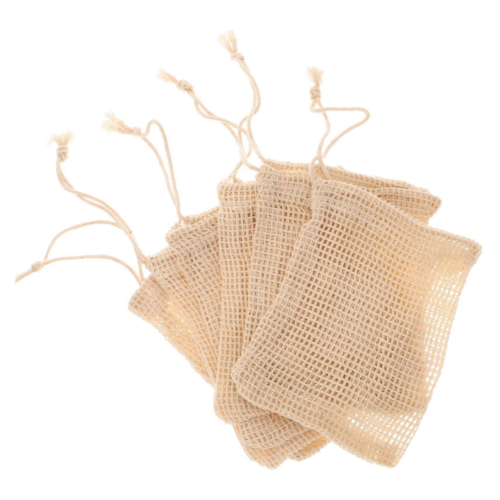 Package includes 6 x soap bags Product overview Durable soap bags made from ramie and sisal in beige. Each bag is designed as an exfoliating mesh pouch with a drawstring closure to hold a bar of soap securely, create rich lather, and allow the soap to dry between uses. The breathable construction helps reduce soap waste and keeps shower and sink areas cleaner. Key benefits Extends soap life: Mesh design and hanging option let soap drain and dry quickly to reduce softening and waste. Better lather with less soap: Fine mesh helps produce rich foam for efficient cleansing. Gentle exfoliation: Textured natural fibers provide a pleasant scrubbing effect without harsh abrasion. Clean and convenient storage: Drawstring closure keeps soap contained and prevents soapy residue on surfaces. Durable and reusable: Ramie and sisal construction resists wear for long term use. Quick drying: Breathable materials speed up drying to maintain hygiene and soap condition. Features and specifications Package quantity: 6 soap bags Size: 14.00 x 10.00 x 1.00 cm (approximately 5.51 x 3.94 x 0.39 in) Material: ramie and sisal Color: beige Closure: drawstring for easy opening and secure fastening Design: mesh pouch for foaming and a textured surface for exfoliation How to use 1. Insert a bar of soap into the pouch and pull the drawstring to close. 2. Rub the pouch between your hands or directly on the skin to generate lather. 3. Hang the bag by the drawstring after use so the soap can dry. 4. If you prefer, remove the soap from the pouch to soak or rinse before reusing. Practical use scenarios Daily shower: Use to wash and exfoliate skin while producing a rich foam with less soap. Travel and gym: Keep a bar of soap contained and dry in a toiletry bag or locker. Bathroom and kitchen sink: Store hand soap in the pouch to reduce mess and allow quick drying between uses. What is included Six beige soap bags, ready to use for soap saving, foaming, exfoliating, and neat storage.