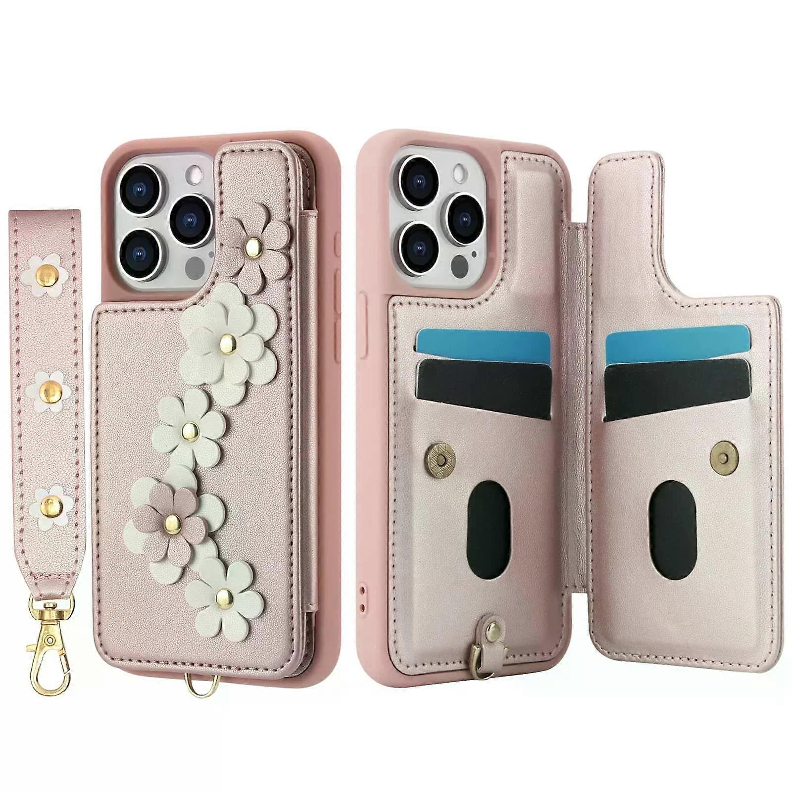 For iPhone 16 15 14 Pro Max Plus Case, Wallet with Card Holder, Cute Flower Design Crossbody Purse, Magnetic Kickstand Cover