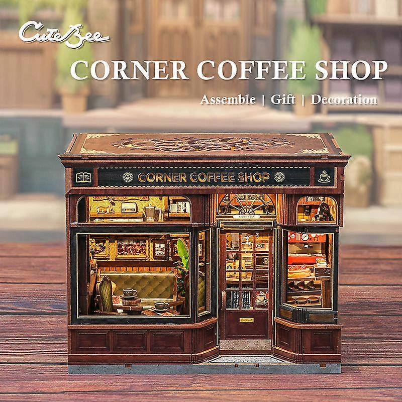 CUTEBEE Book Nook Kit DIY Doll House with LED Light Bookshelf Insert CORNER COFFEE SHOP Miniature Model For Birthday Family Gift