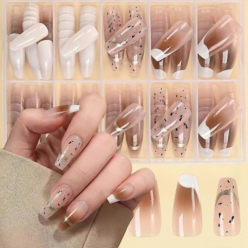 120PC Metallic French Line Ice-Transparent Press On Nails Brown White Long Coffin Polka Dot False Nails Full Cover Fake Nails Ti