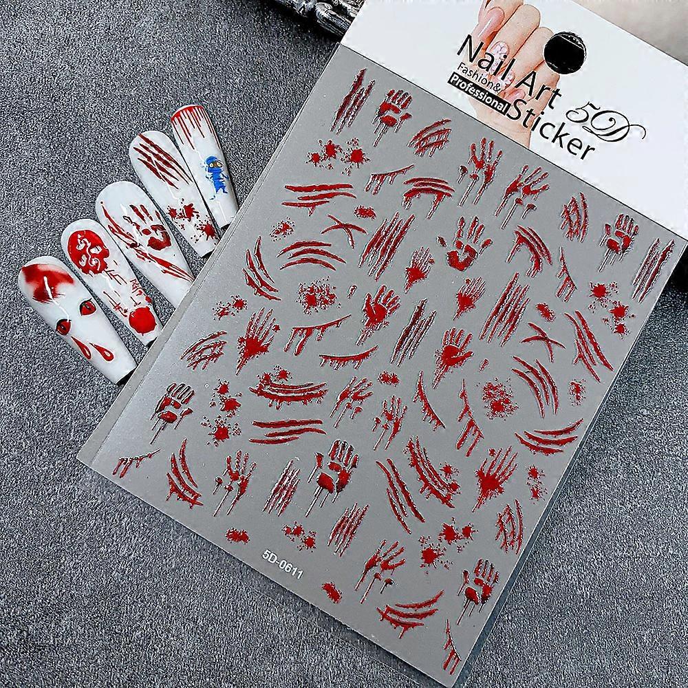 1pcs Bloody Hand Halloween Nail Sticker 5D Embossed Scary Blood Red Blood Nail Decals Halloween Party Self Adhesive Nails Decora
