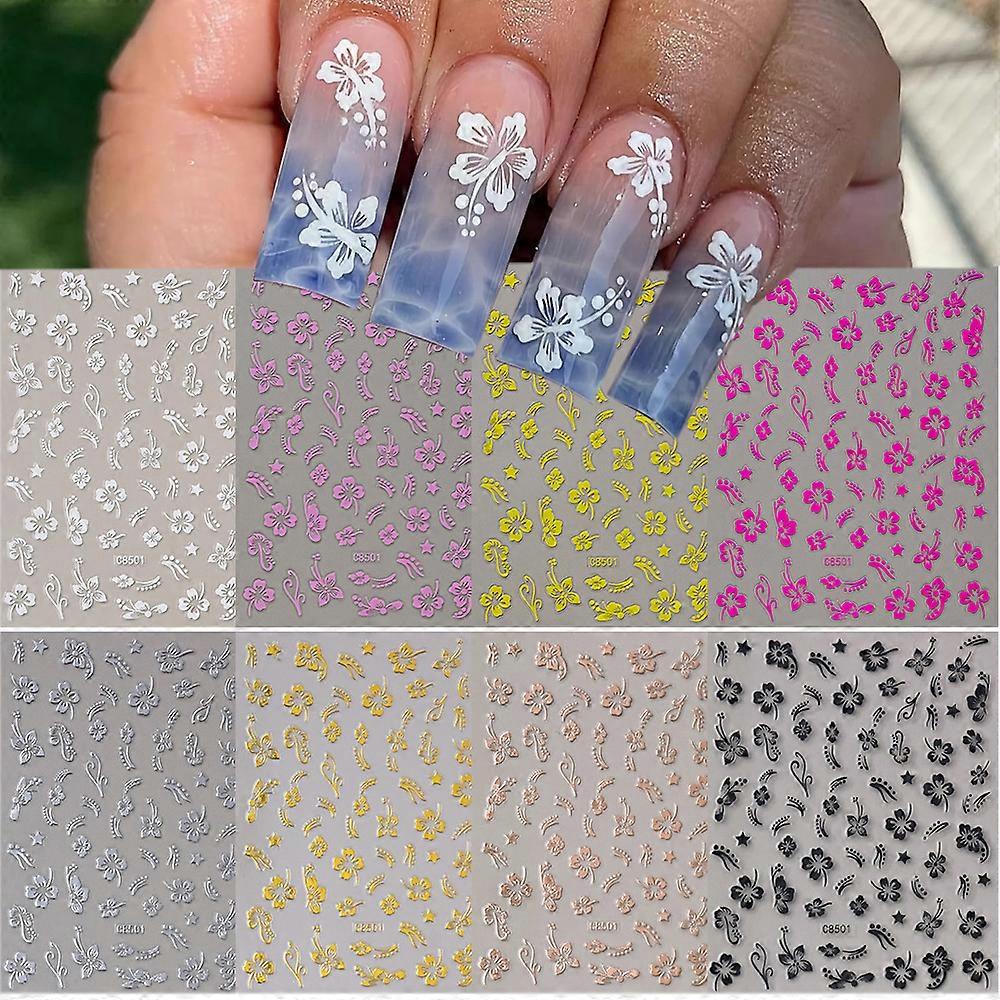 8Colors Hibiscus Flower Nail Stickers 3D White Pink Black Gold Silver Hibiscus Petal Nail Decals 8*10cm Adhesive Nail Art Slider