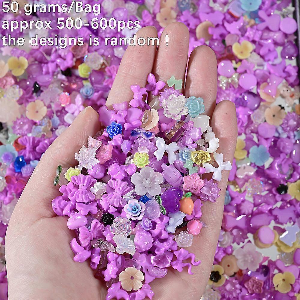 50g/bag mix Purple Flower Ribbon Bow Nail Rhinestones 500pcs+ Resin Heart Butterfly Bowknot Nail Charms Acrylic Nail art Decor