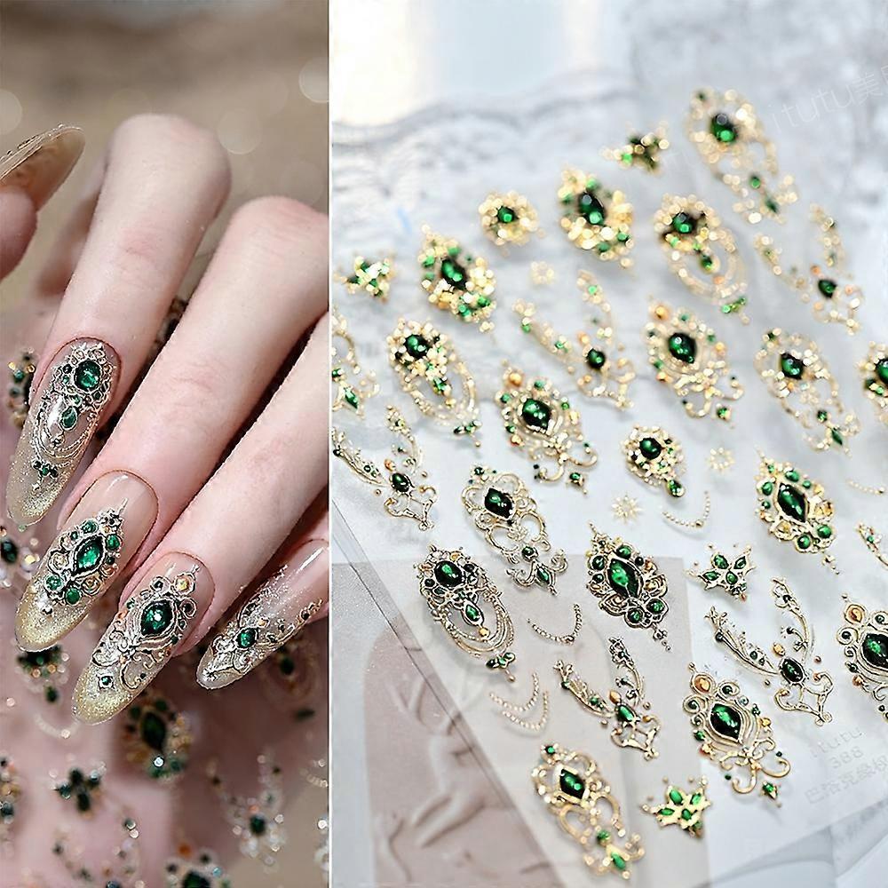 5D Embossed Emerald Gemstones Nail Art Stickers Luxury Golden Frame Baroque Flower Nail Decals Green Rhinestones Nail Supplies