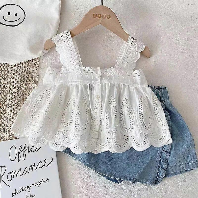 Girls Outfit Sets Summer Kids Clothes Girls Lace Edge Pure White Baby Girl Casual White Suspender+Denim Skirt Children's