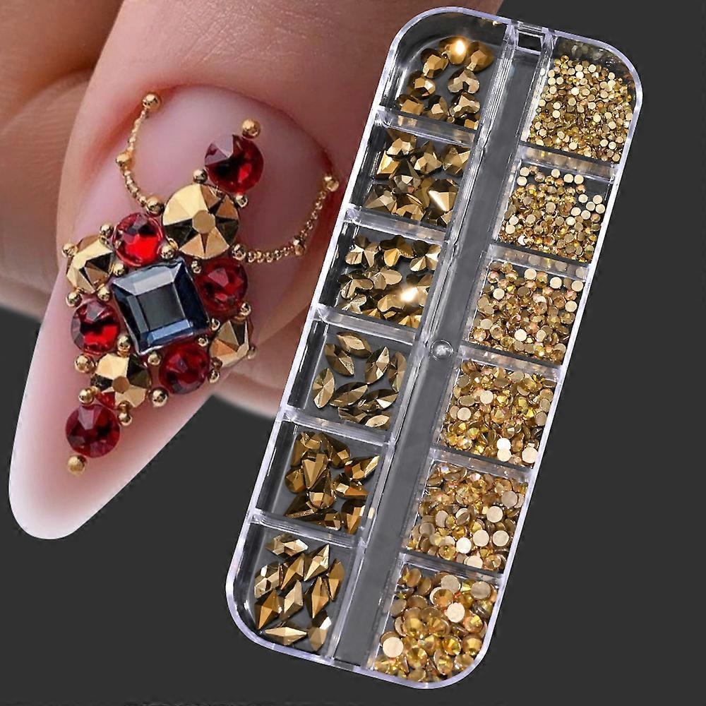 12Grids Mixed-Shape Gold Diamond Nail Rhinestones Non Hot Fix Flatback Crystal Charms 3D Glitter Nail Rhinestones Maincure Decor