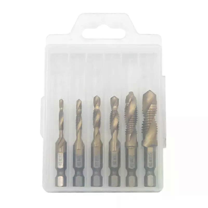 6pc High Speed Steel M3-M10 Titanium Plated Composite Tap Hexagonal Drill and Tap Integrated Tap Machine with Hole Chamfer Tool