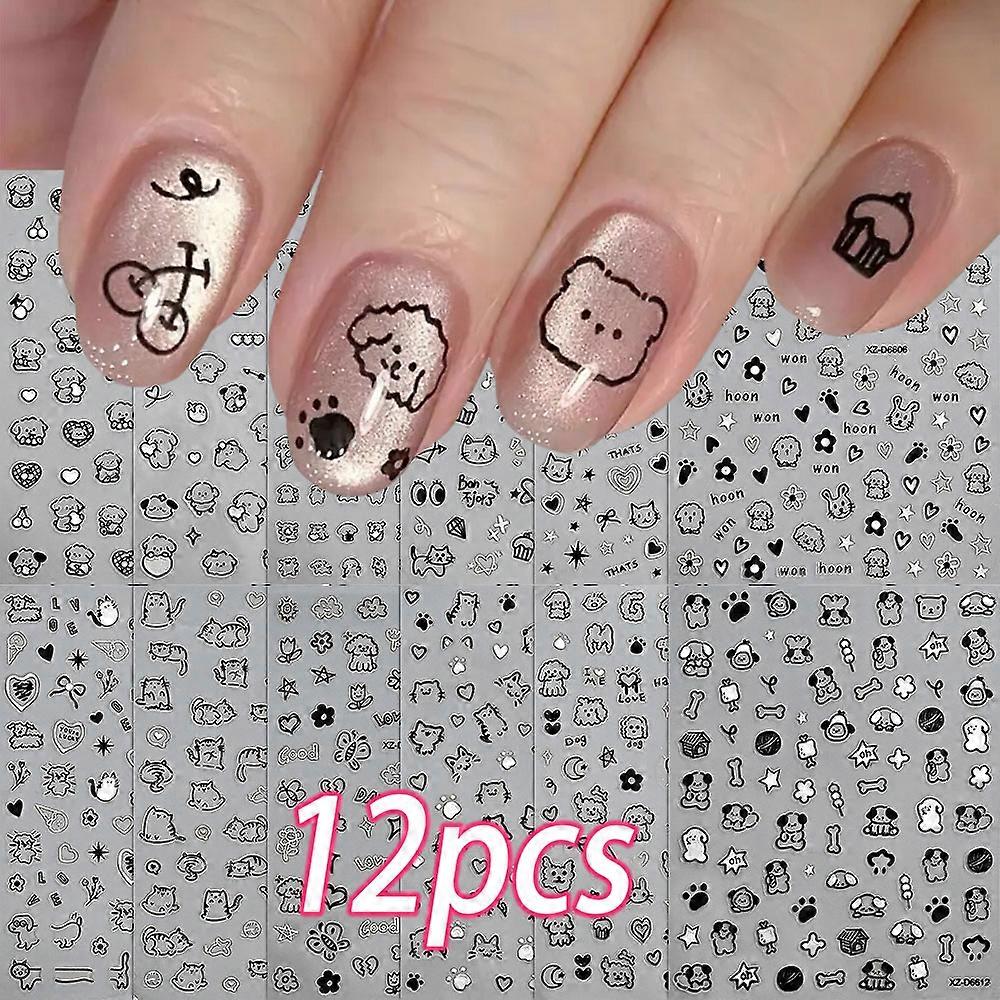12pcs/set Cute Cartoon Dog/Cat Nail Art Stickers 3D Graffiti Black Cat Dog Nail Decals 8*10cm Self-Adhesive Cartoon Nail Art Su