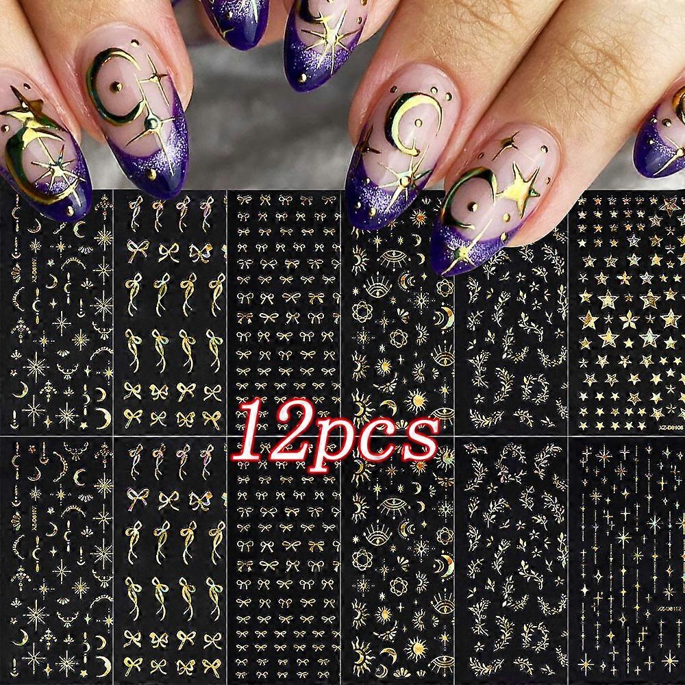 12pcs Laser Gold Star Moon Nail Art Sticker 3D Bohemia Style Cute Bow Nail Decals Y2k 8*10cm Self-Adhesive Manicure Supplies DR4