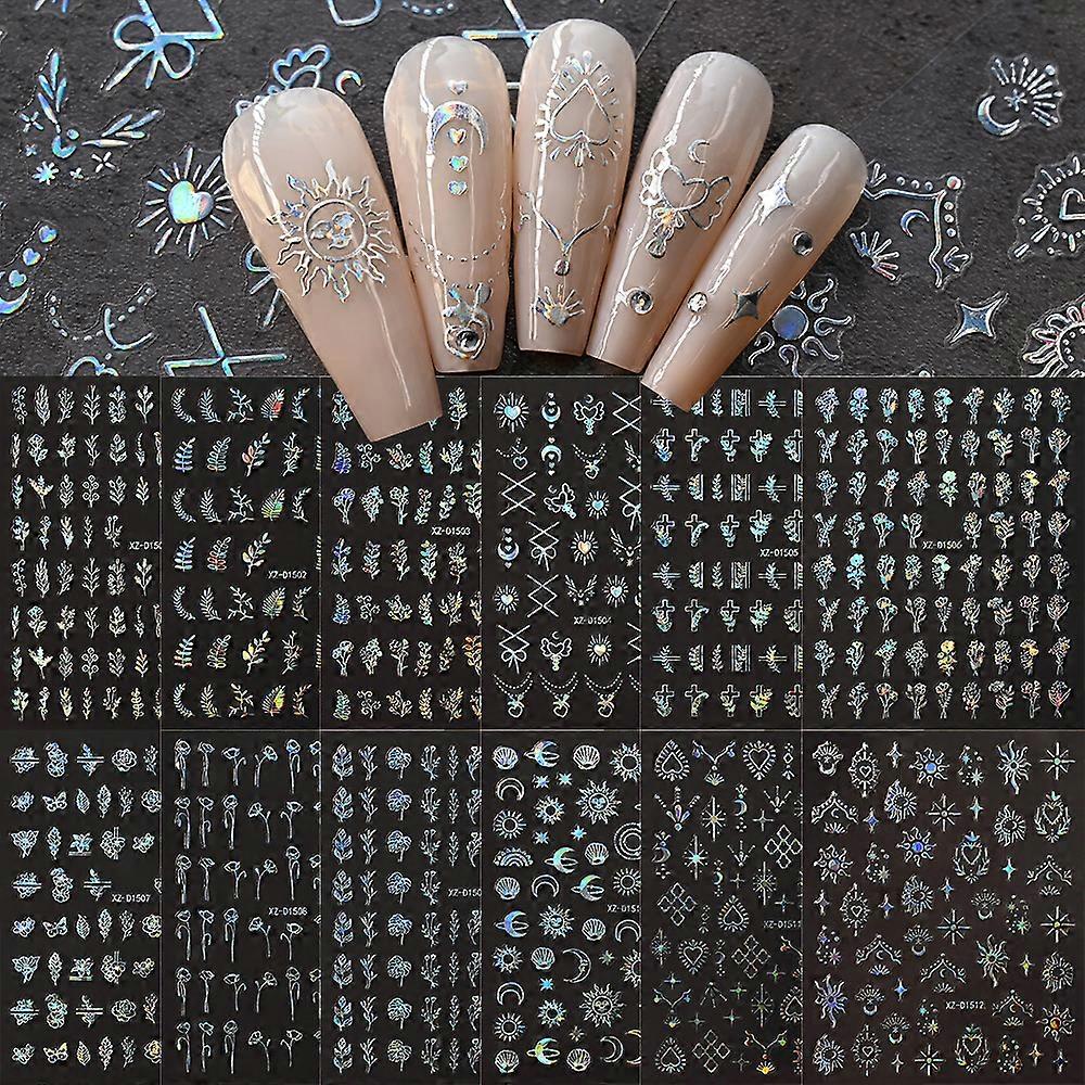 12pcs/set 3D Silver Laser Sun/Star Moon Nail Sticker Holographic Bronzing Rose Leaf Nail Decal Adhesive Nail Art Decora 8*10cm
