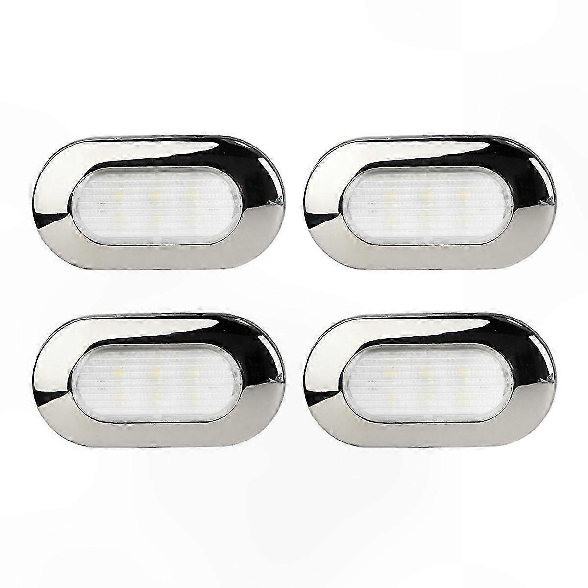 This is a small and practical daylight white oval courtesy light, aisle light, step light, or internal or external door control lighting or utility light for storage areas. It is mountable and can be used for lighting on ships, yachts, RVs, trucks, cars, and more. 6 LED, Daylight White Waterproof: IP67 LED: 6 pcs Mountable Working Voltage: DC 12 V Wattage: 1.2 W Installation guide not included; professional installation is recommended. Please verify the item carefully to ensure it meets your needs. The product may be updated periodically; due to different production batches, slight variations in appearance or color may occur, which do not affect functionality. Color: As shown Material: Stainless steel Package Contents: 4 × RV corridor lights Only the above items are included; other products are not included. Note: Light reflection and display differences may cause slight color variation between the image and the actual product. Measurement tolerance: ±1–3 cm.