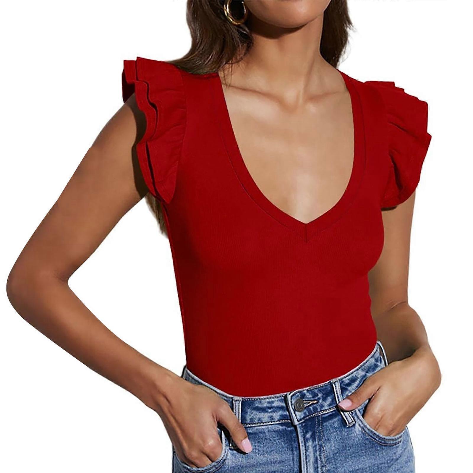 Camiseta sin mangas de verano para mujer, cuello en V, con volantes, de punto acanalado, sexy, ropa de mujer Burgundy XL