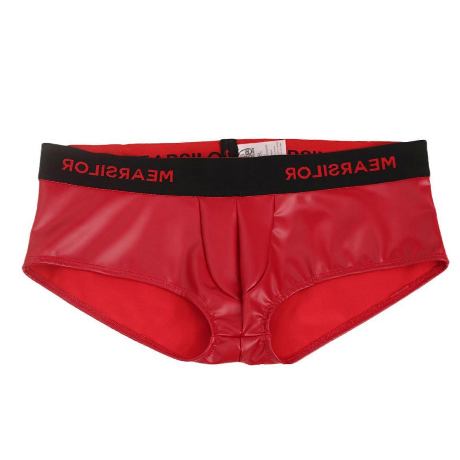 Mens Wet Look Faux Leather Underwear Lingerie Letter Print Low Rise Shorts Pants Convex Pouch Boxer Briefs Underpants Red XL