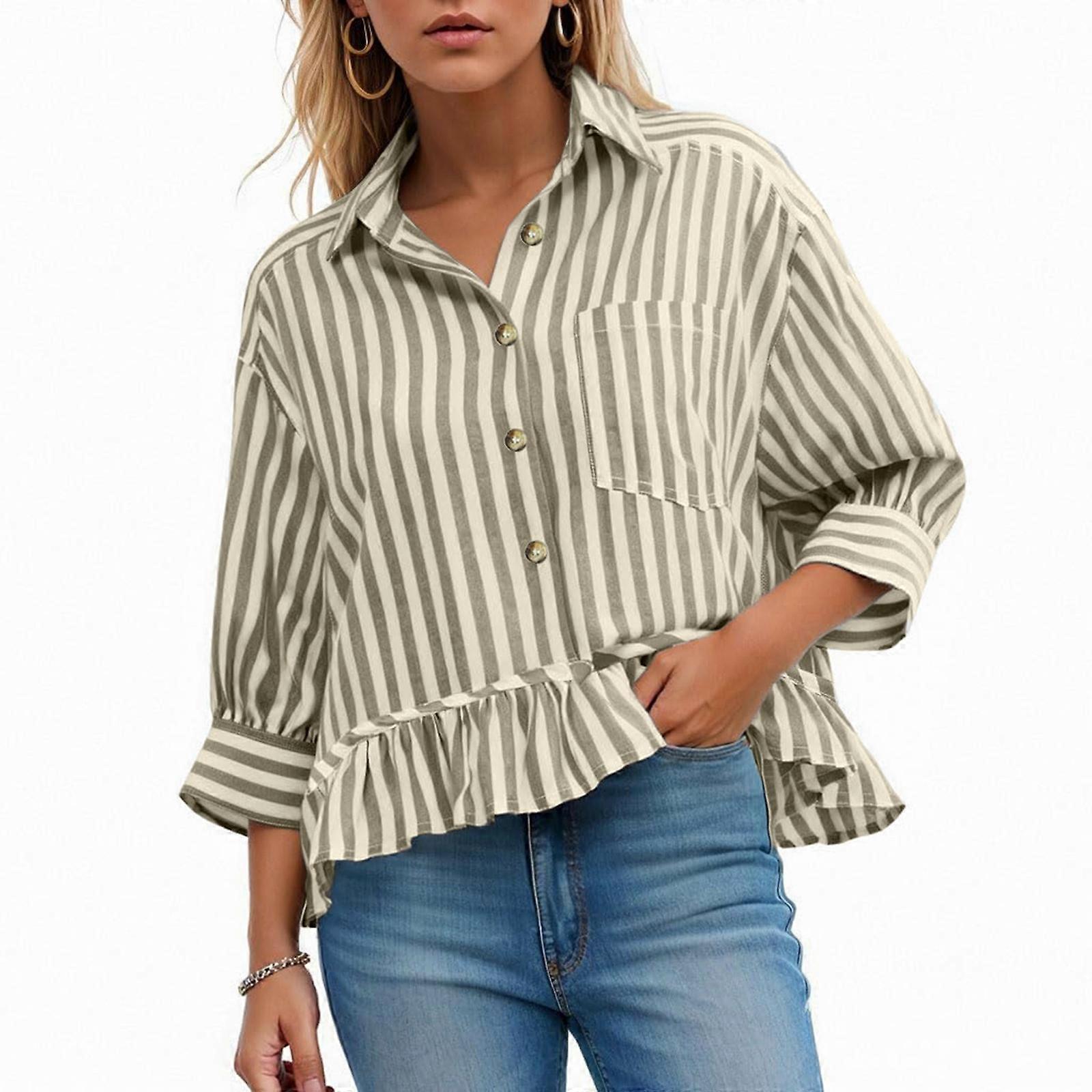 Womens Summer Tops Dressy Casual Blouse Top Ruffled Short Sleeve Button Down Striped Shirt olivegreen XL