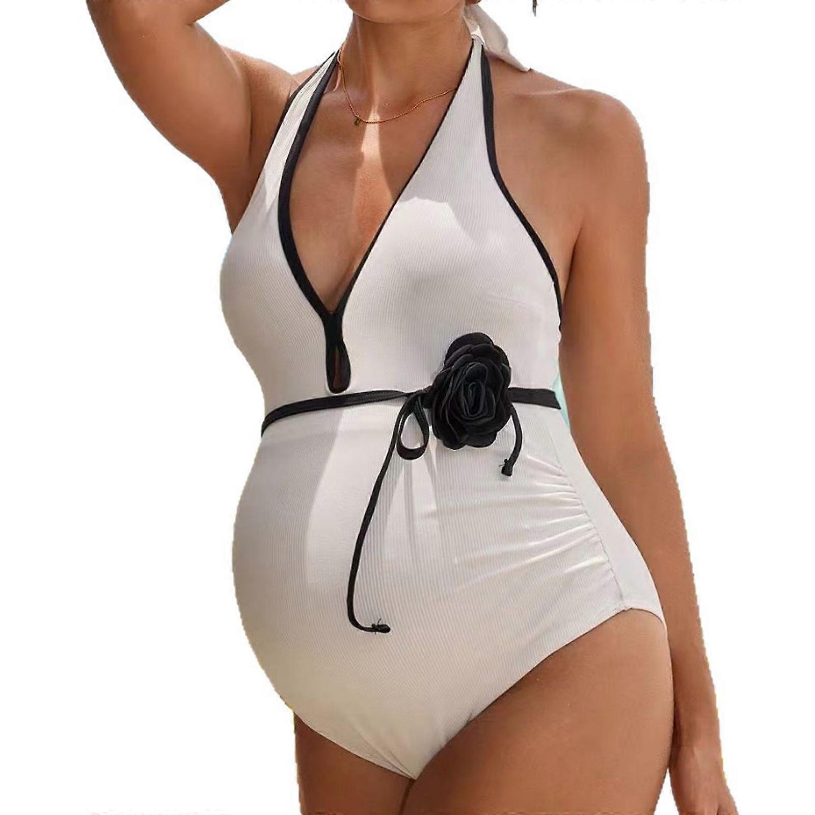 Pregnancy Swim Wear Halter Neck Conjoined Swimsuit Deep V Cut for Belly Comfort Supportive Elastic Backless Bikini White XL