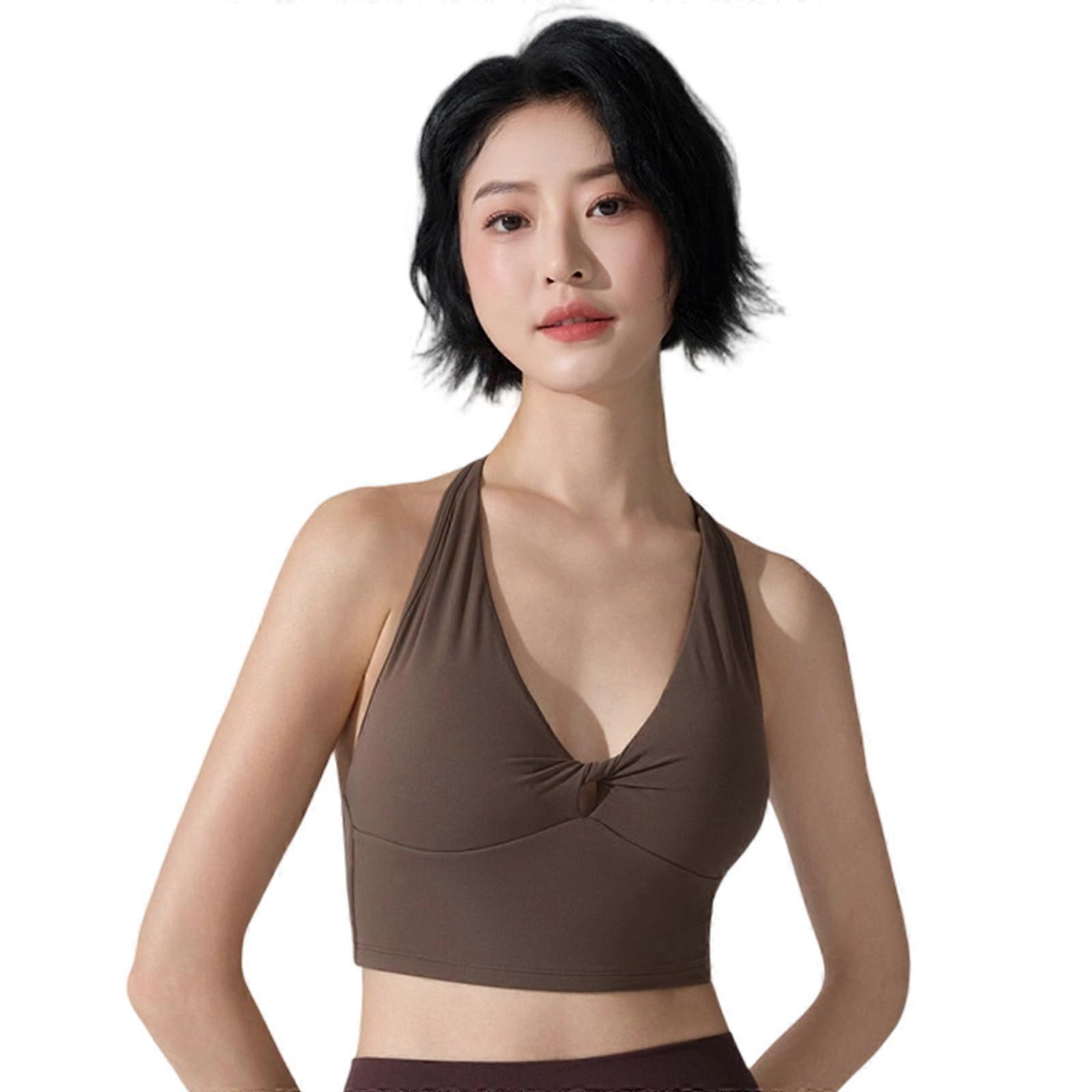 Women's Workout Sports Bras Twist Front Fitness Training Gym Bra Yoga Crop Tank Top tea brown S