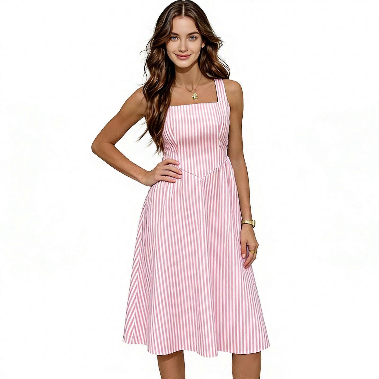 Comfortable Cotton Blend Sleeveless Square Neck Color Block Striped Maxi Dress Cinching Waist For Women Parties Pink XL