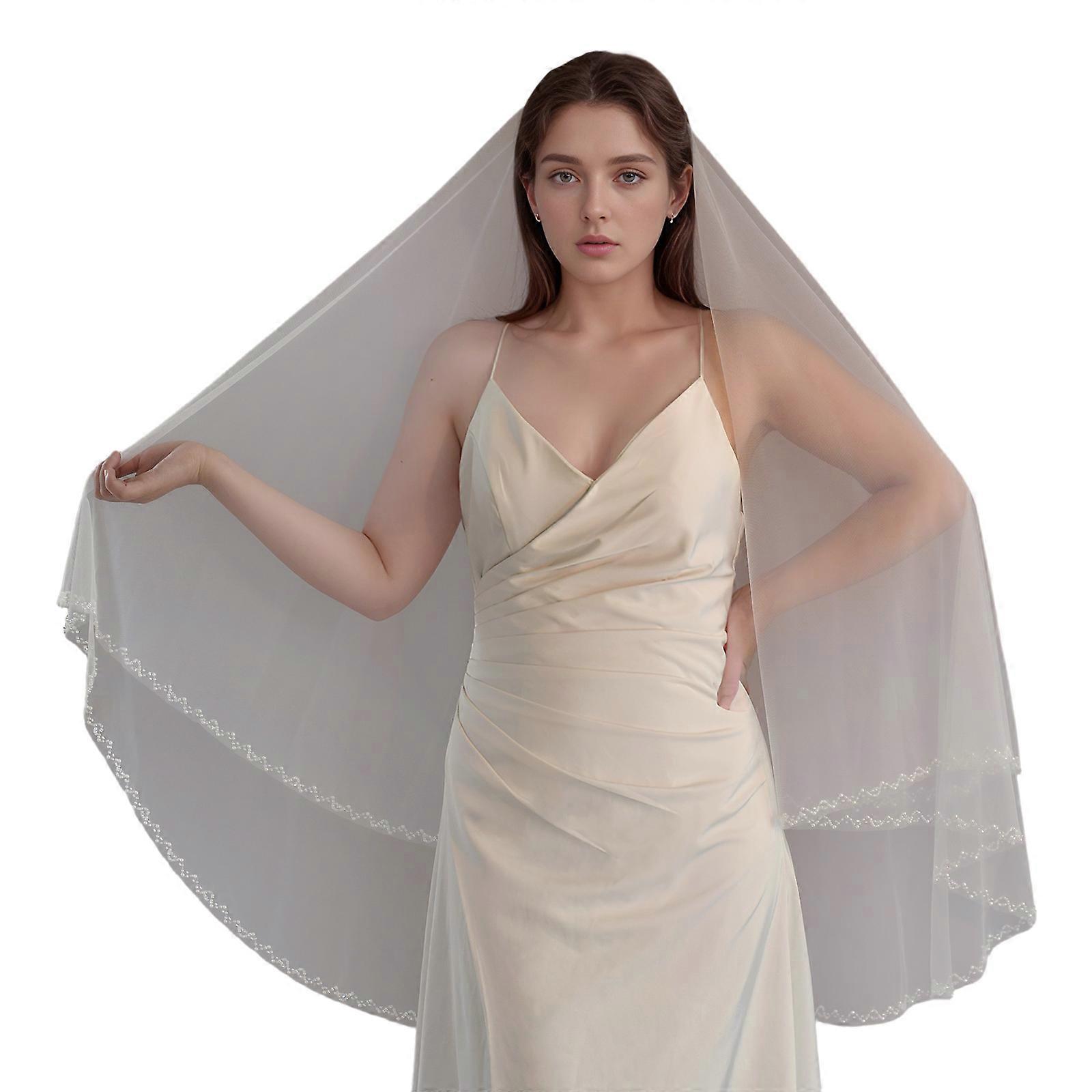 Seethrough Sheer Bridal Veils Double Layer Design Hand Sewn Bead Trim Head Veils for Wedding Event Gathering Bride Props Multicolor