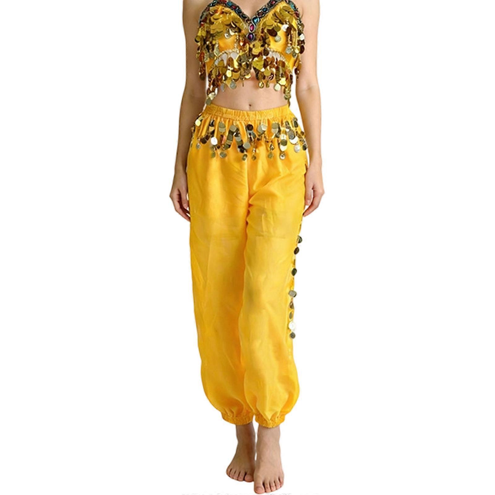 Women Belly Dance Costume Belly Dance Outfits Belly Dance Coin Bra Top Belly Dancing Trousers for Halloween Party Stage Yellow OS