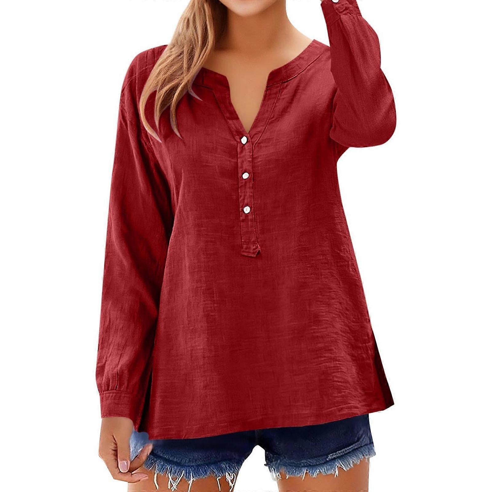 3/4 Length Sleeve Tops for Women V Neck Button Down Shirts Casual Blouses Loose 3/4 Tops Red XL