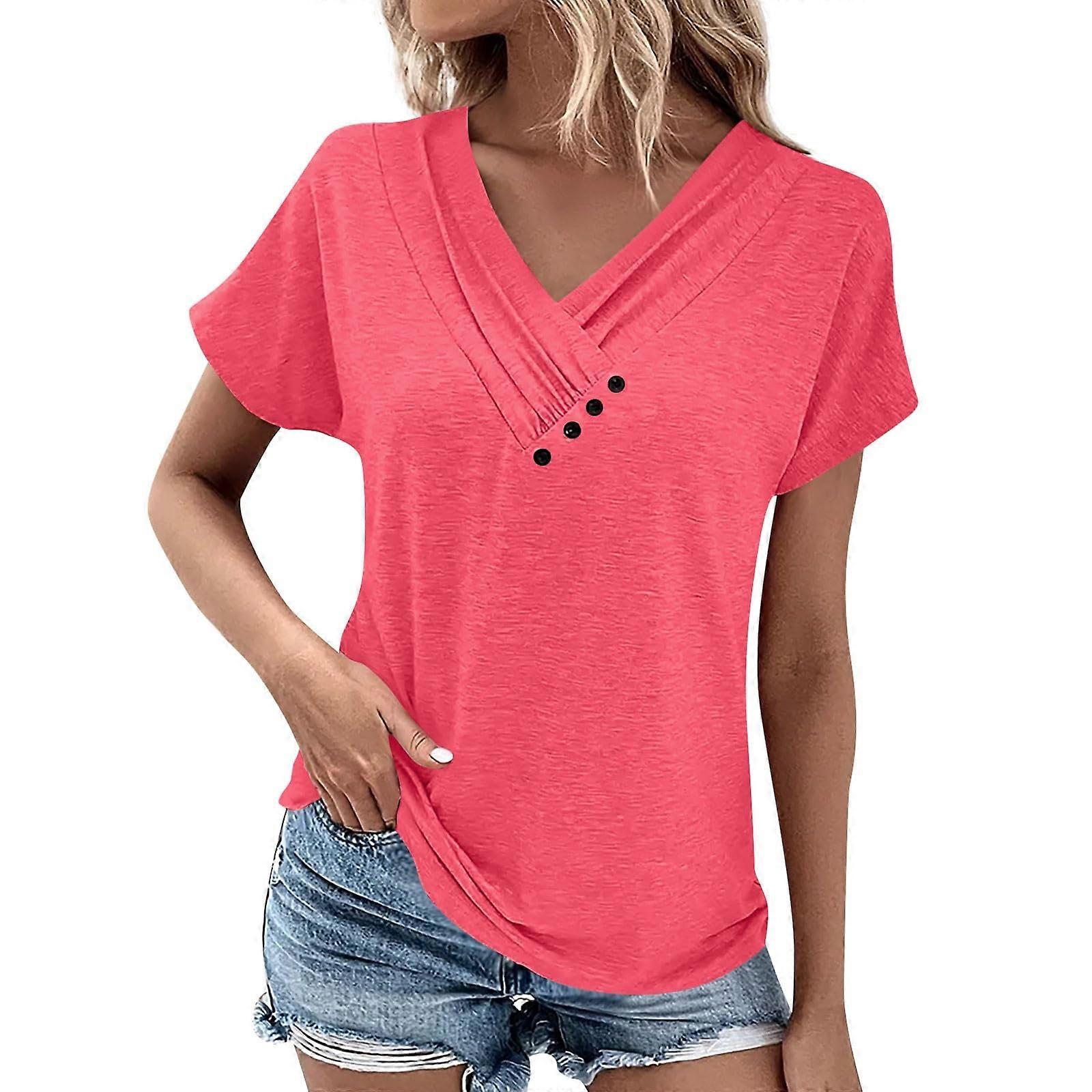 Womens Short Sleeve Tunic Top V Neck Button Shirts Dressy Casual Business Blouses watermelon red XL