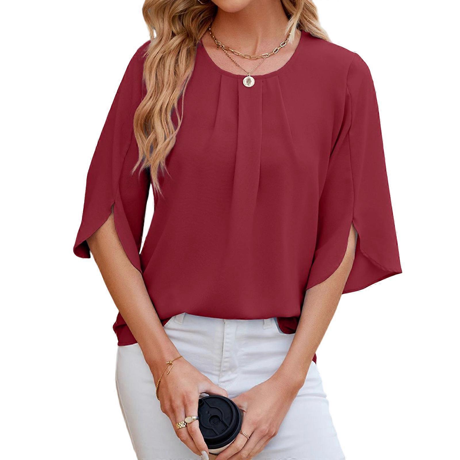 Solid color round neck five-quarter sleeve short sleeve loose chiffon blouse for women Burgundy XL