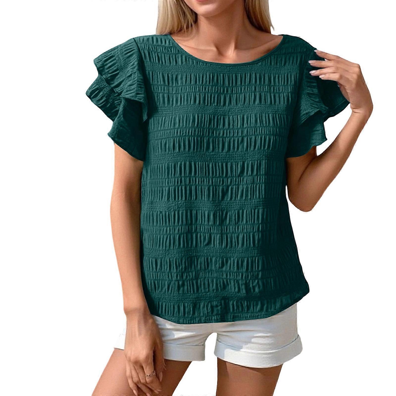 Women's Layer Ruffle Butterfly Sleeve Top Casual Summer Crewneck Blouse tealcolor XL