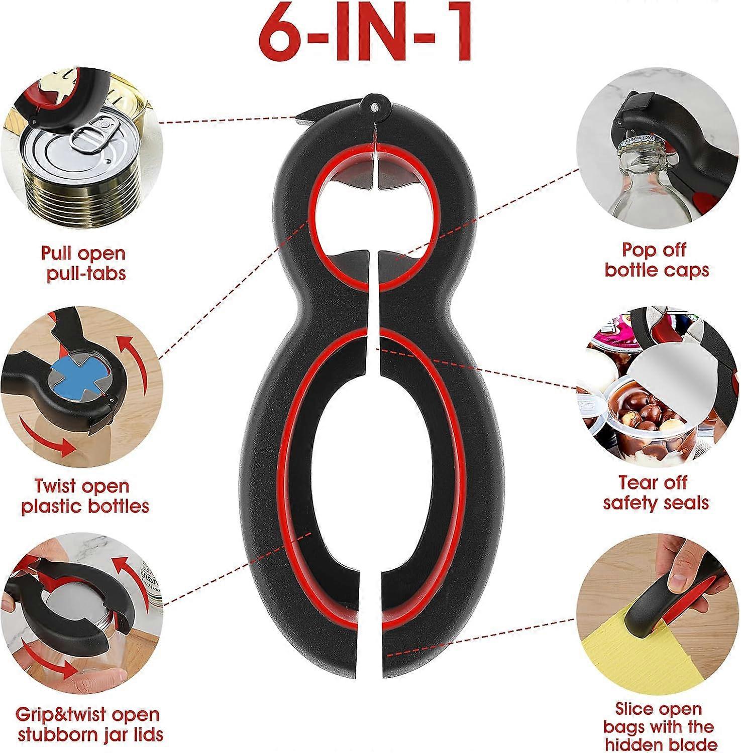 6IN1 DESIGN Enjoy the convenience and versatility of our 6in1 bottle opener This versatile bottle opener is designed to handle a variety of tasks with ease The small circle is perfect for opening soda and beer bottles while the large circle acts as a reliable can opener In addition the hook on the top allows you to easily remove labels from cans and the builtin tip is perfect for cutting sealed bags COMFORTABLE GRIP With an ergonomic design you can enjoy a comfortable grip The can openers are designed with user comfort in mind The handle provides a secure nonslip grip even when wet This makes them ideal for those with weak hands or limited dexterity keeping them safe when opening cans Say goodbye to stubborn lids and enjoy the simplicity of our versatile can opener HIGHQUALITY MATERIALS Our beer bottle opener is made from highquality materials and is durable These premium materials are made of ABS and stainless steel ensuring durability and longlasting use You can be sure that these can openers can be reused for a long time making them a reliable addition to your kitchen arsenal Easy to use Simply place the bottle opener on the appropriatesized lid and simply twist to easily open the seal Otherwise use a bottle opener to open the lid The humanized design saves time and energy in the kitchen Cleaning and storing the multifunctional bottle opener is also a breeze It can be easily washed by hand or in the dishwasher then dried and stored in the kitchen cabinet Portable Our can opener measures about 145 x 6 cm compact and easy to carry making it a practical assistant for various occasions You can take them anywhere such as home travel picnic or camping It is a practical and useful tool for opening various types of bottles cans jars and bags