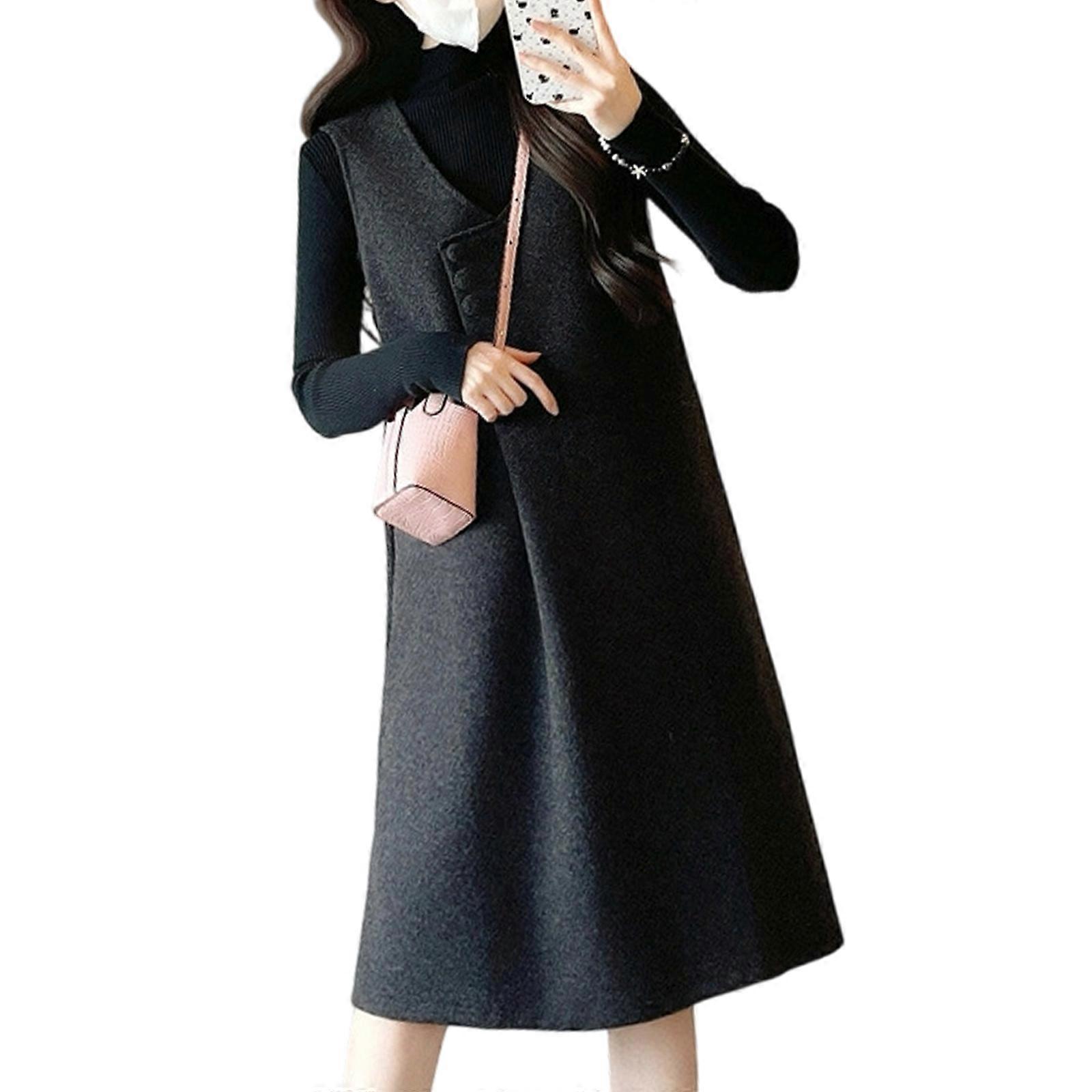 Loose Fit Pregnancy Dress Middle Length For Autumn Winter Polyester Comfortable Breathable V Neck Easy Care black gray XL
