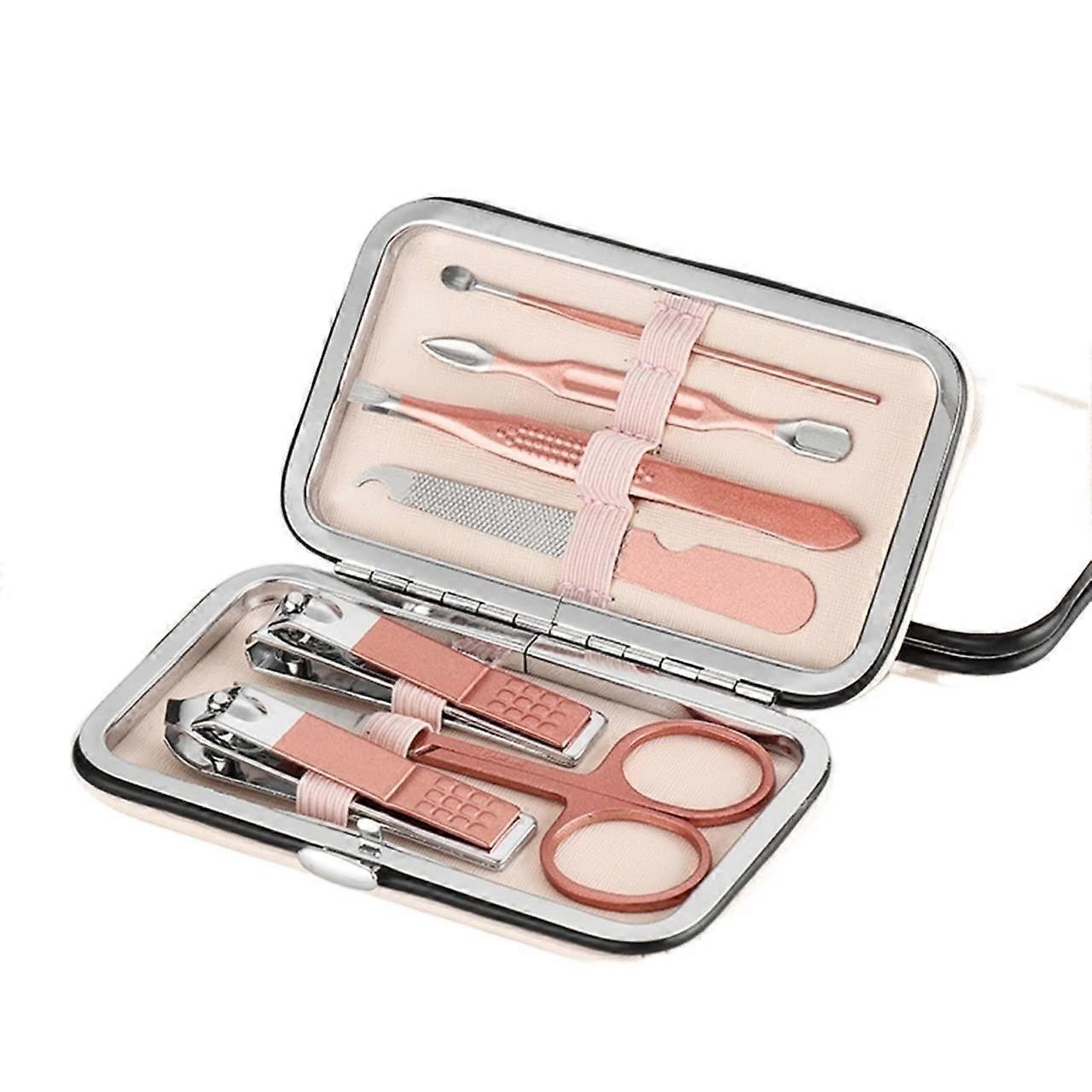 Compact 7piece manicure and pedicure kit designed for facial care, hand care, and foot care. Durable stainless steel tools sit inside a leather case with a smooth zipper to protect components and extend their working life. Lightweight and portable for professional or home use. Key benefits Complete care in one kit: Seven tools cover basic facial care, hand care, and foot care needs in a single set. Durable construction: Tools are made from sturdy stainless steel for longlasting use. Protected and portable: Included leather case with smooth zipper keeps tools organized and reduces wear. Sharp and water resistant: Nail clippers are sharp and resistant to rust, providing clean, reliable cuts. Lightweight and travel friendly: Compact design fits easily into a purse, toiletry bag, or salon kit. What you get Set includes seven professionalstyle manicure and pedicure tools plus a leather carrying case with zipper closure. Performance and materials Material: stainless steel for corrosion resistance and durability. Case: leather exterior with smooth zipper for secure storage and easy access. Performance: sharp cutting edges for precise trimming; tool surfaces resist moisture to limit rusting. Practical applications Athome grooming: Keep the kit on a bathroom shelf or in a drawer for regular nail maintenance and quick touchups. Travel and business trips: Compact case fits into luggage or a carryon for onthego grooming. Salon or mobile technician use: Lightweight, durable tools suitable for professional settings where organized storage is needed. Who it is for Home users who want a reliable, allinone grooming kit. Professionals who need a portable set for client appointments. Gift givers seeking a practical present for friends, family members, or a partner. Care tips Rinse and dry tools after use to maintain performance. Store tools in the provided leather case to prevent loss and reduce wear.