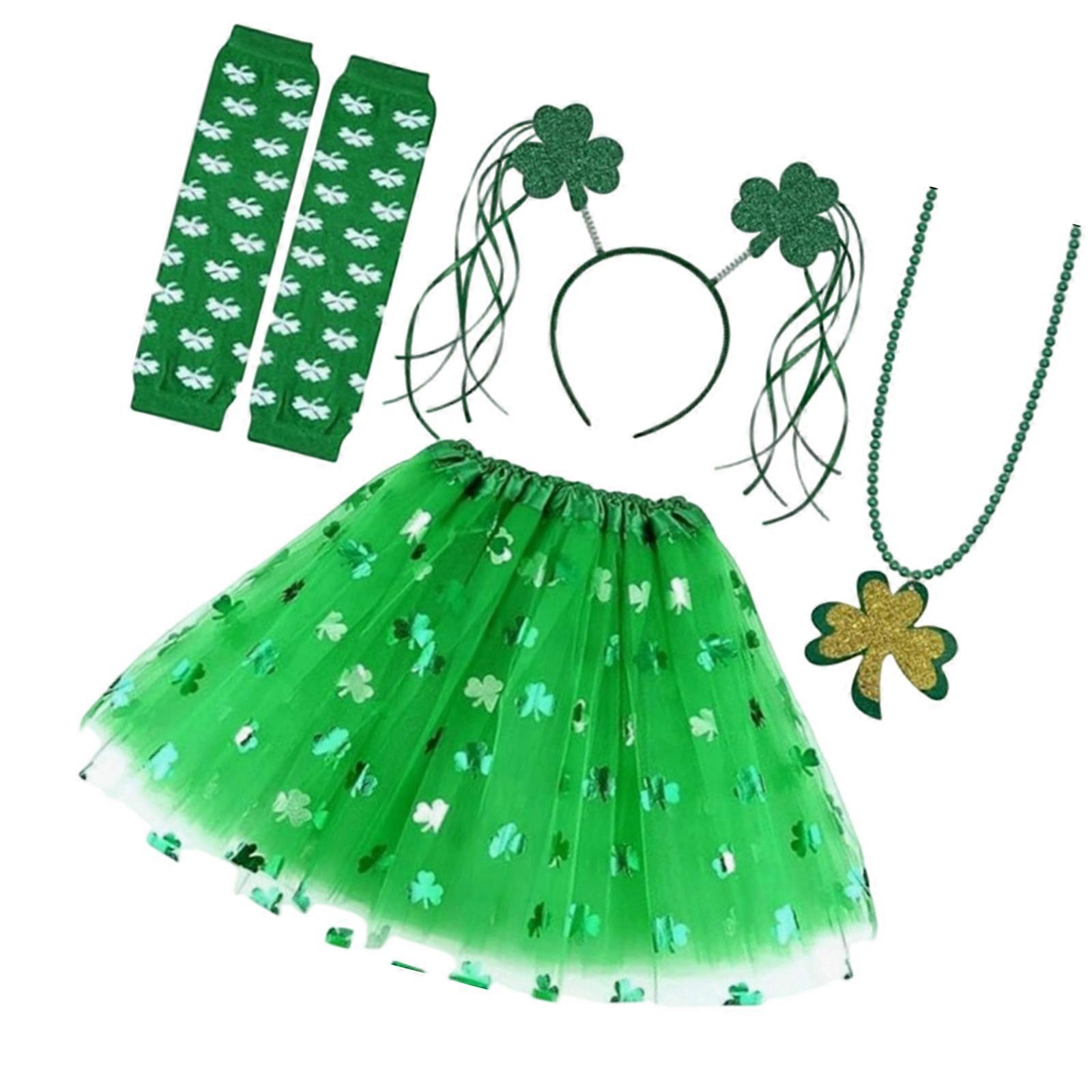 Lightweight Nonwoven Shamrock Necklace And Arm Sleeves Costume Skirt Headband Set For Comfortable Party Wear At Festival Green