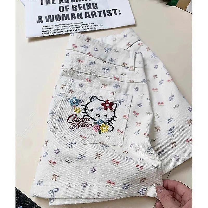 Bow Floral Print Hello Kitty Denim Shorts Women Summer 2025 Y2K Aesthetic Cute Sweet Sexy Daily Wear