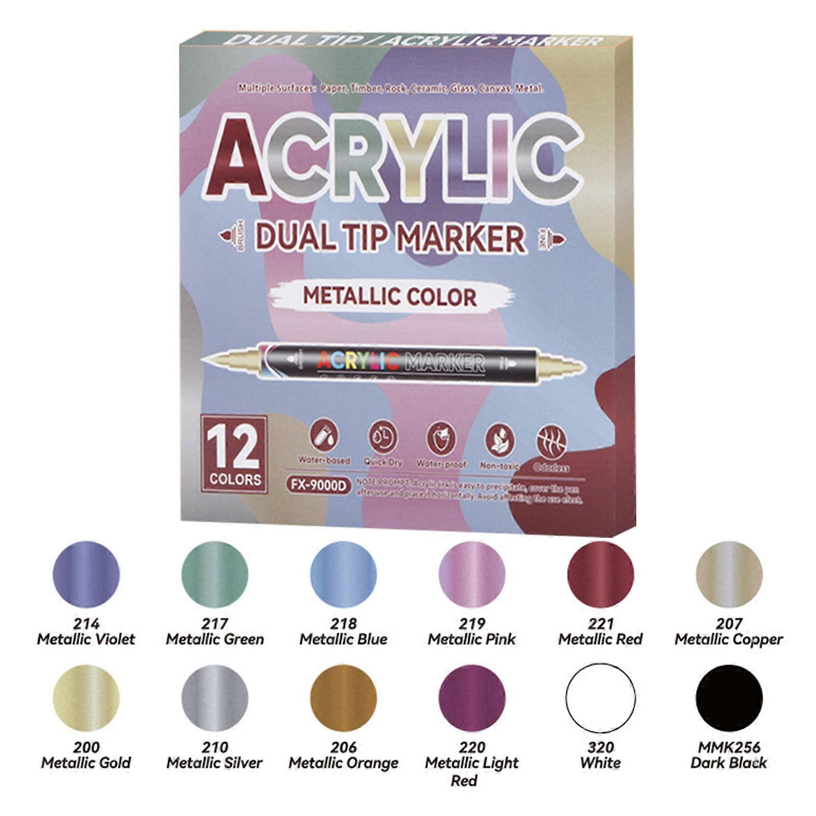 12 Color Double End Acrylic Marker Waterproof Metallic Paint Pen for Coloring Painting on Paper Wood Fabric Metal Stone Multicolor