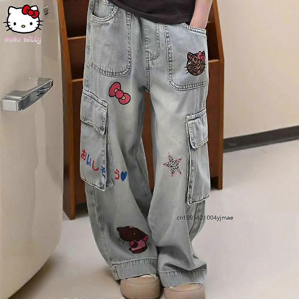 Sanrio Hello Kitty Girl Jeans Sweatpants Children's Clothing Summer Soft Printing Cartoon Cute Working Equipment Flared Trousers