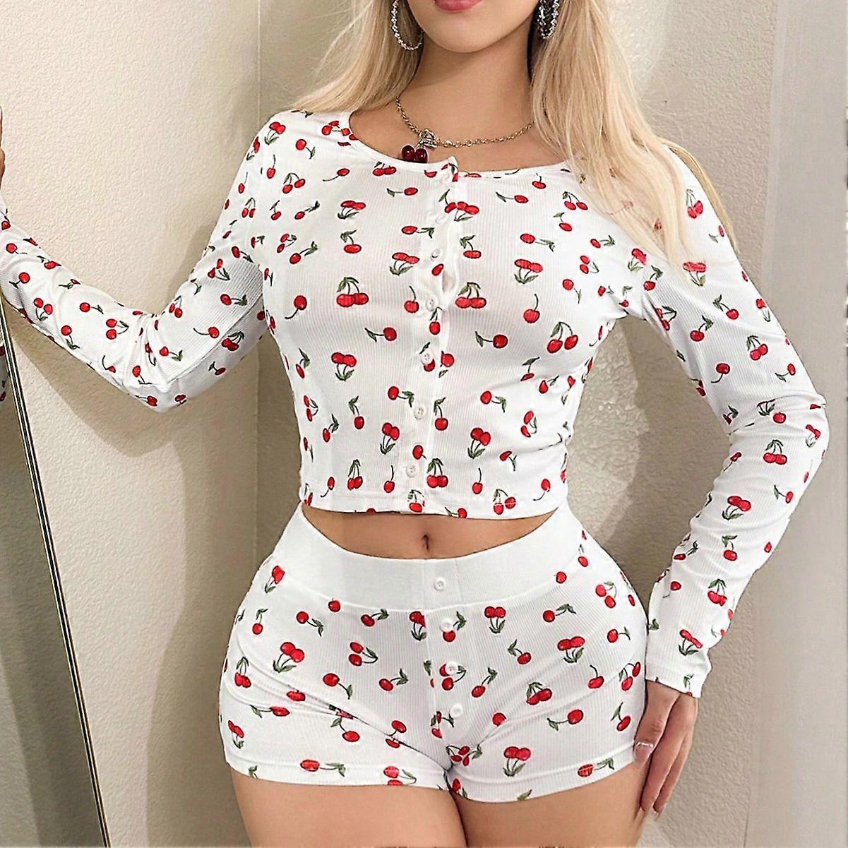 Women's Pajamas Set Cute Heart Print Soft Button Cardigan Long-sleeved Shorts Stretchy Comfortable Sleepwear Homewear