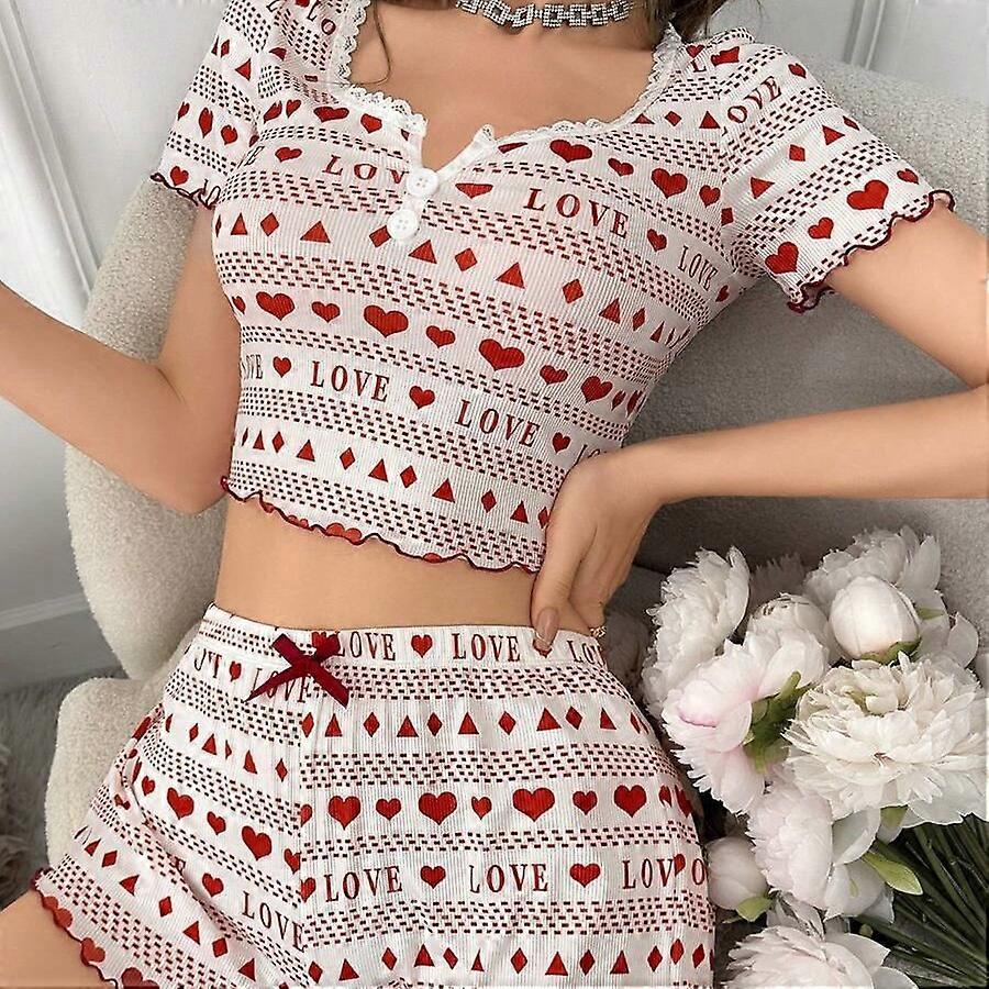Women's Pajamas Set Sleepwear 2 PCS Short Crop Tops And Shorts White Ventilate Soft Casual Love Printing Nightgown Set