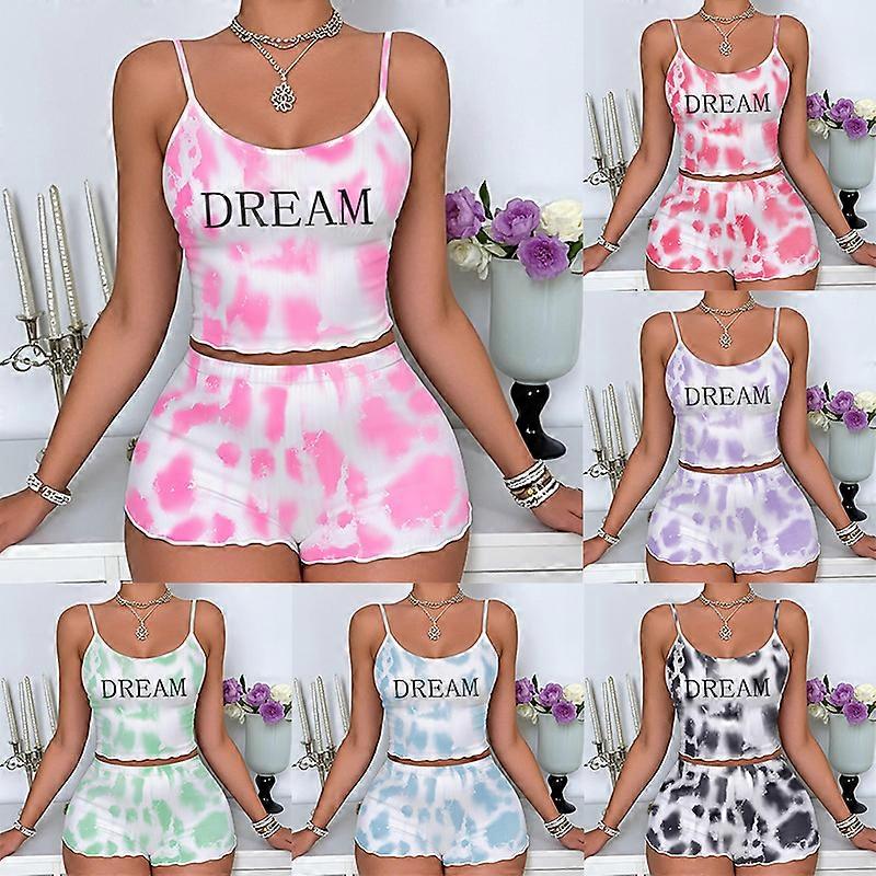 Summer Pajamas Sets Women Sleepwear Sexy Lingerie Cute Tie-dyed Print Sleeveless O-neck Thin Tops With Shorts Set Underwear