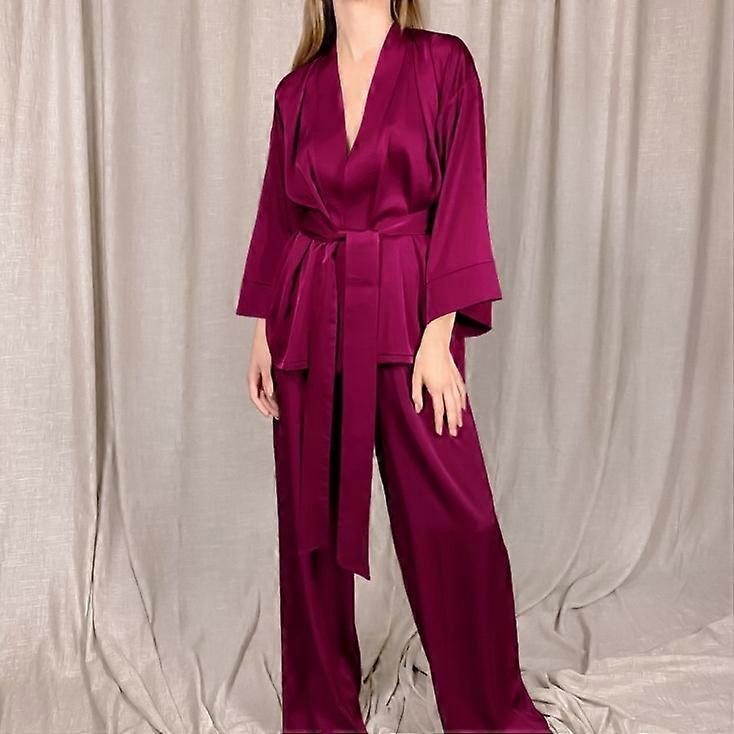 Solid Women Robes with Sashes 2 Piece Set Wrist Sleep Tops Satin Pants Loose Pajamas Casual Sleepwear Female Home Suits