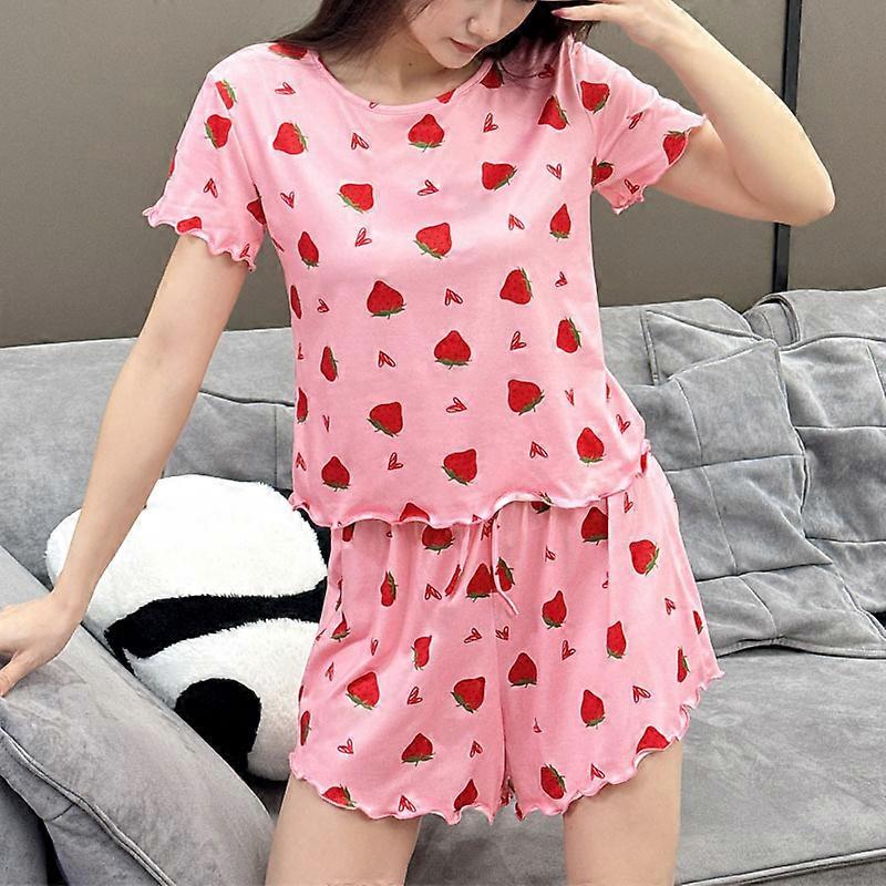 Pajamas Set For Women Breathable Strawberry Print Sleepwear Comfy Short Sleeve Top And Shorts Pyjama Home Loungewear For Ladies