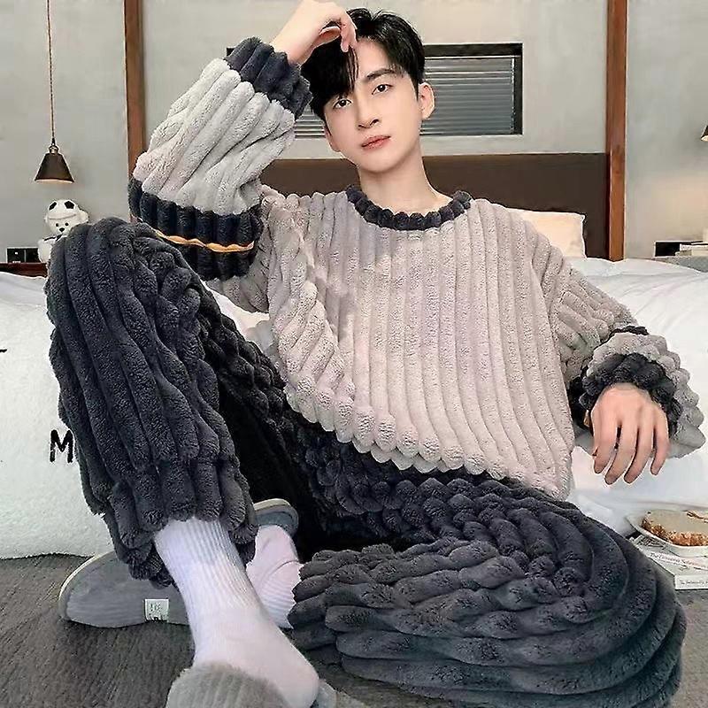 Flannel Pajamas Men Autumn and Winter Coral Velvet Thickened Warm Plus Size Loungewear Crew Neck Pullover Long Sleeve Nightwear